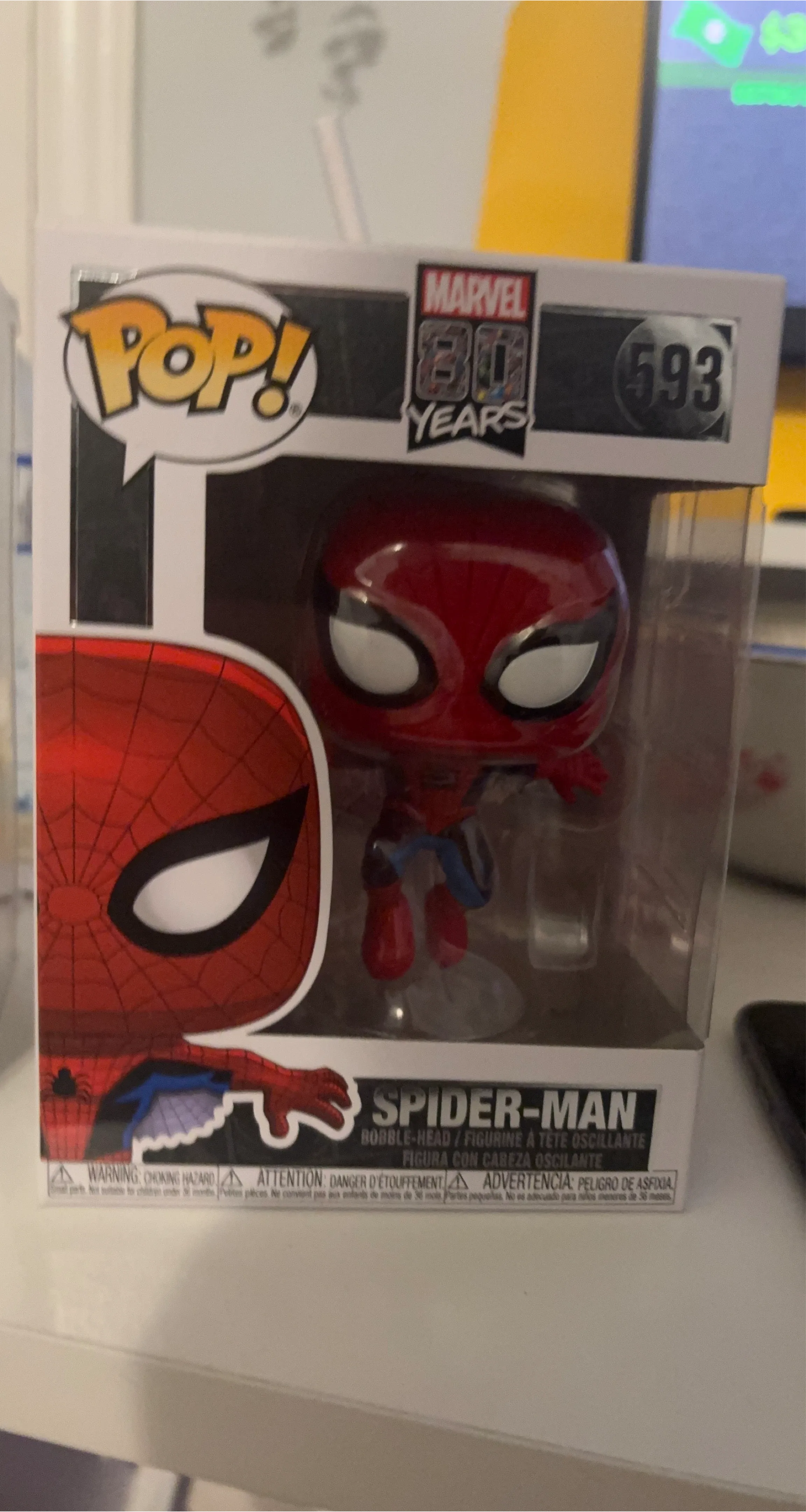 Selling a Funko Pop! Spider-Man bobble-head figure. It's part of the Marvel 80 Years series and is number 593. Comes in the original box!