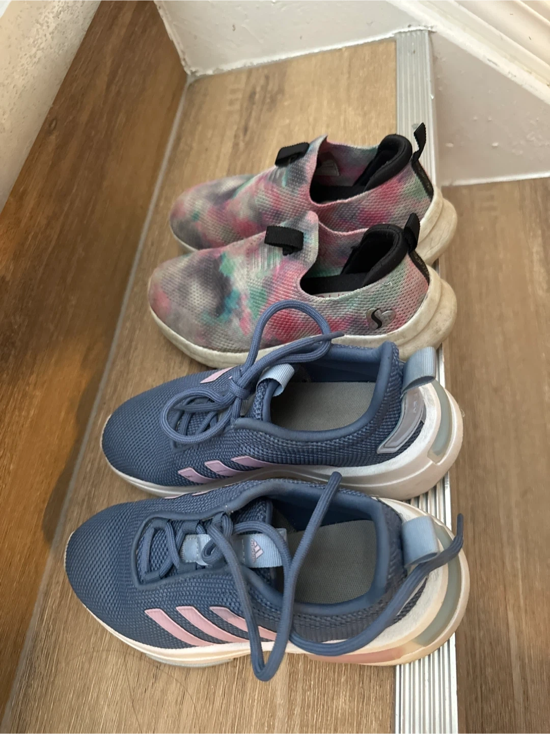 Two pairs of kids' shoes. One pair of blue Adidas sneakers with pink stripes and laces. One pair of tie-dye Skechers slip-on shoes with black accents. Sizes: 13K and 11T respectively. One is like new, other is good.