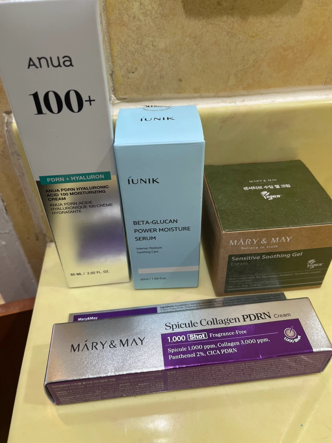 Anua PDRN Hyaluronic Acid 100 Moisturizing Cream, 60ml. iUNIK Beta-Glucan Power Moisture Serum, 50ml. Mary&May Sensitive Soothing Gel Cream and Spicule Collagen PDRN Cream also included. Fragrance-free options available.