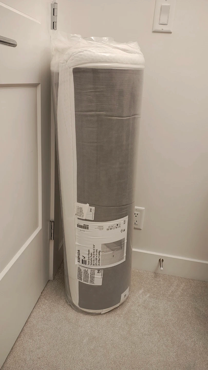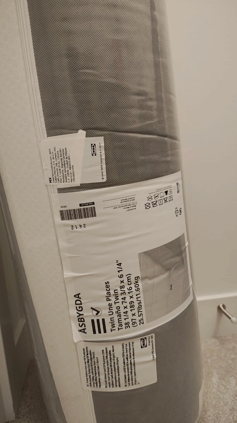 This is an IKEA ÅSBYGDA Twin mattress. It's 38 1/4 x 74 3/8 x 6 1/4 inches (97 x 189 x 16 cm). This mattress weighs 25.5 lbs (11.60kg). It's a Twin One Places mattress.