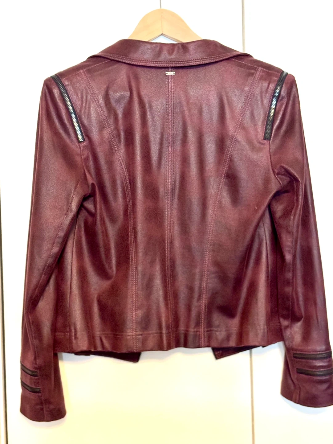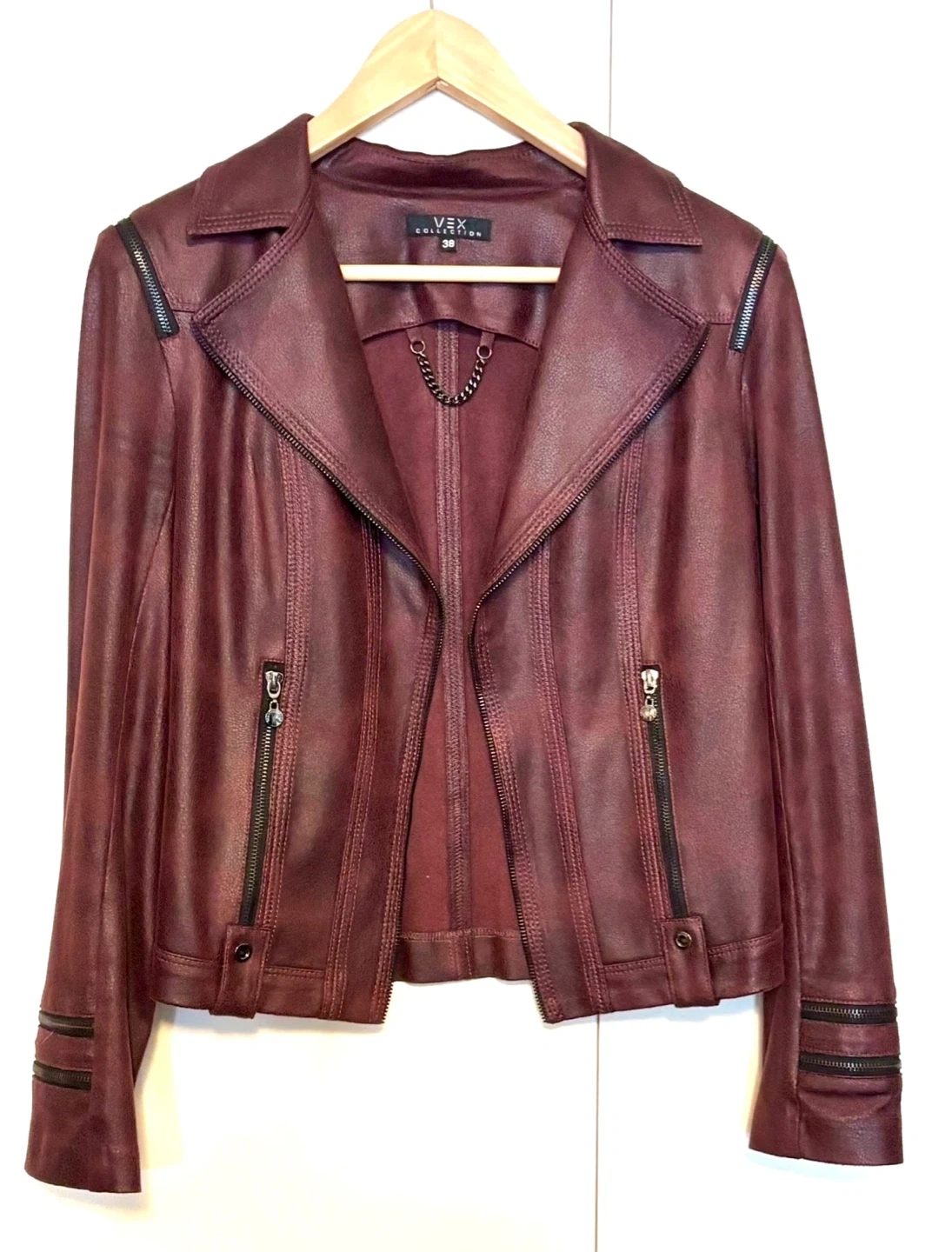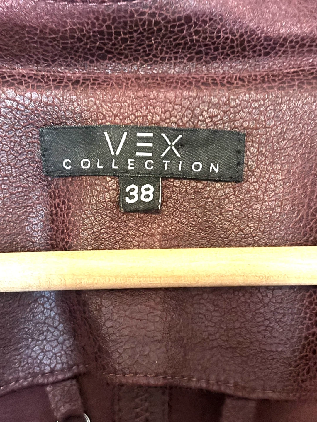 Burgundy faux leather moto jacket from VEX COLLECTION. Features include zippered cuffs and pockets, along with a classic lapel design. Size is 38 (EU).
