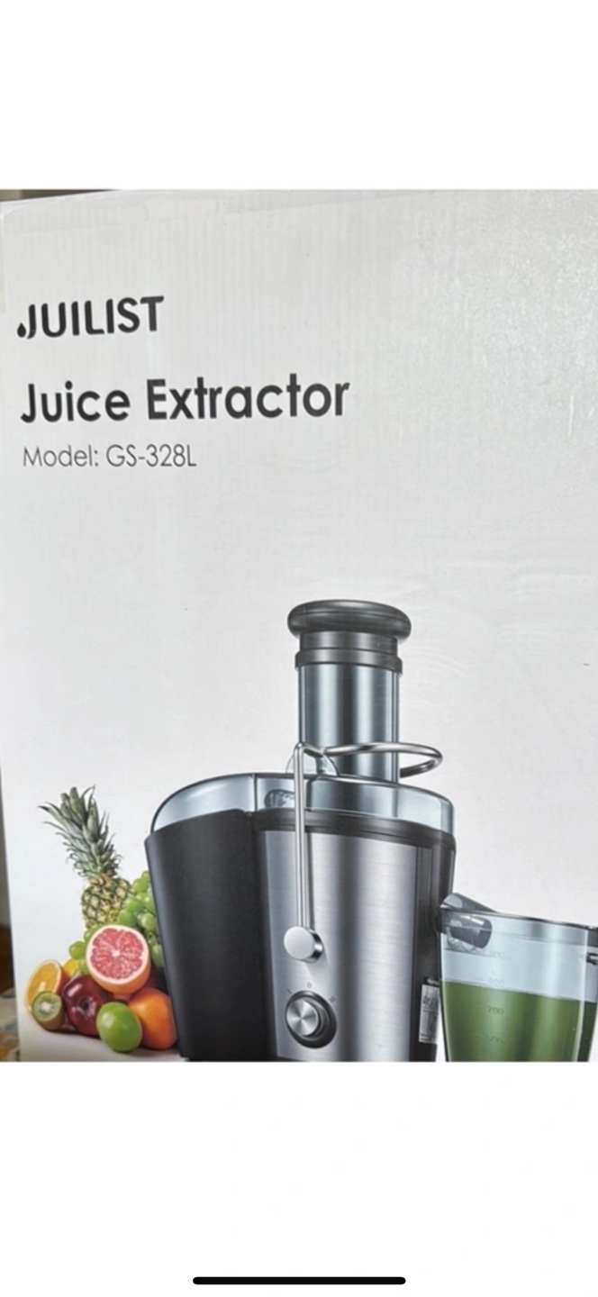 This is a JUILIST Juice Extractor, model GS-328L. It's silver and black with a brushed metal finish. Includes pulp container and juice cup.