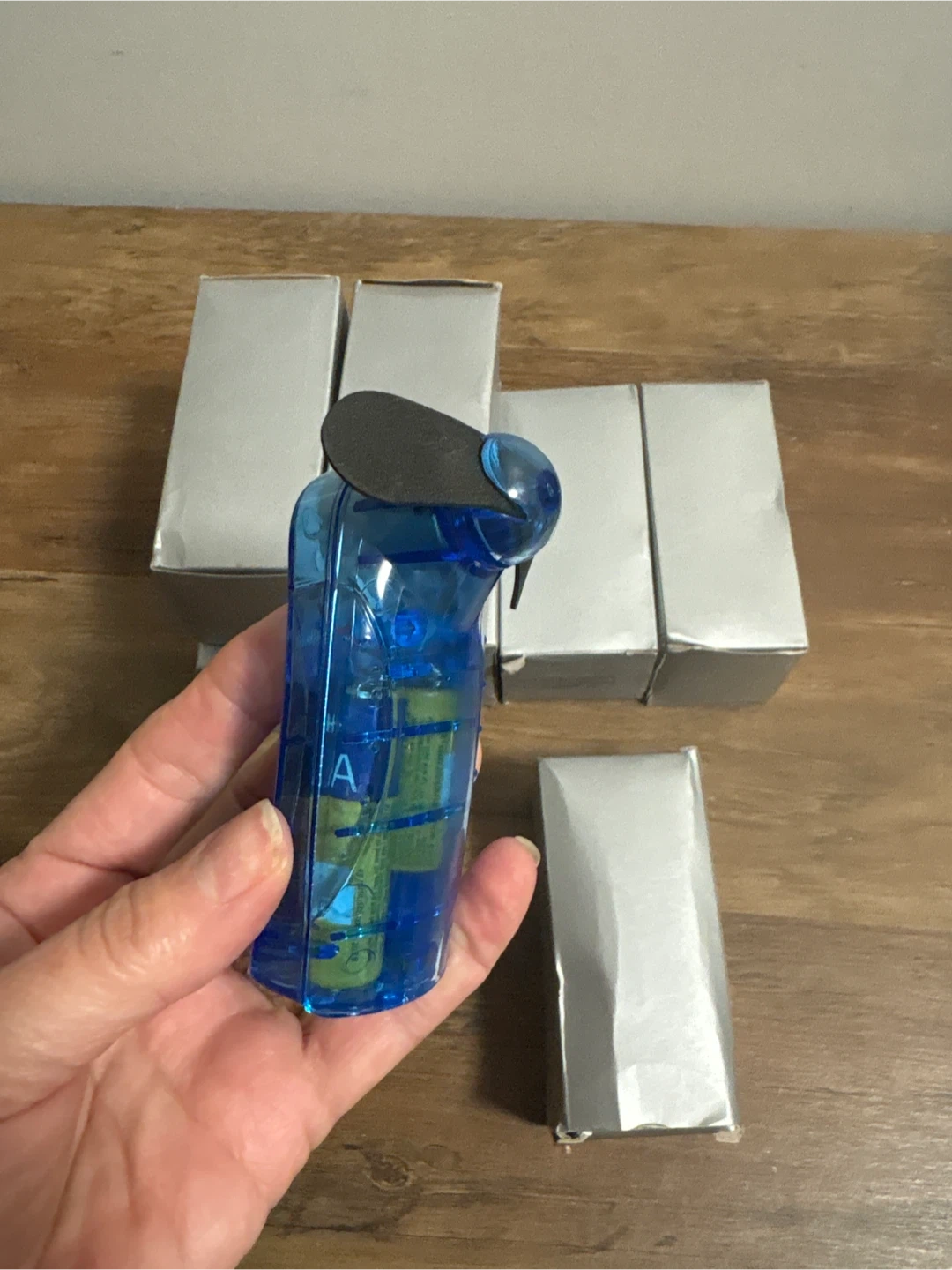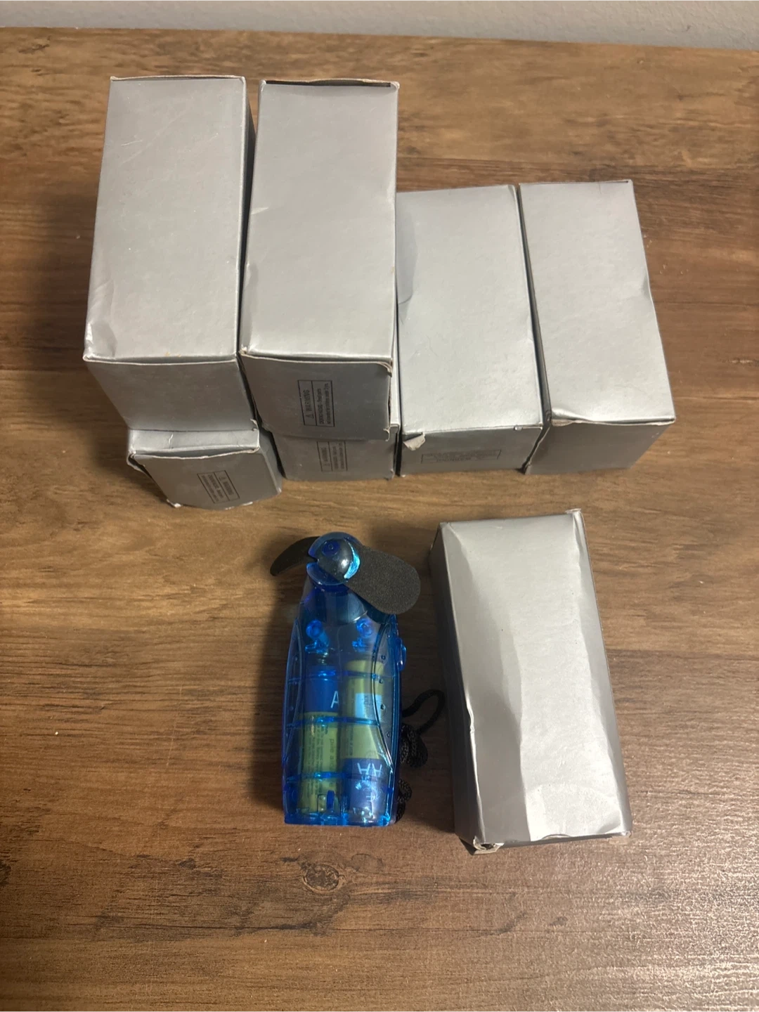 This blue portable mini fan is great for staying cool on the go! It's powered by AA batteries and comes with a lanyard for easy carrying. The fan itself is clear blue plastic. Includes original packaging.