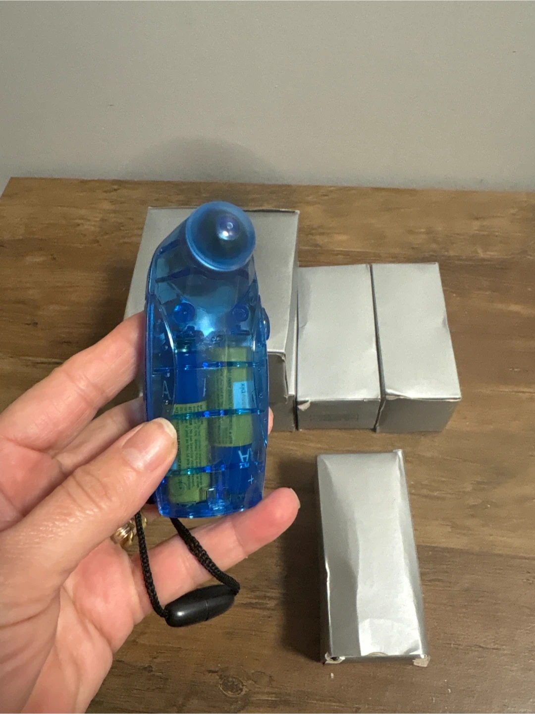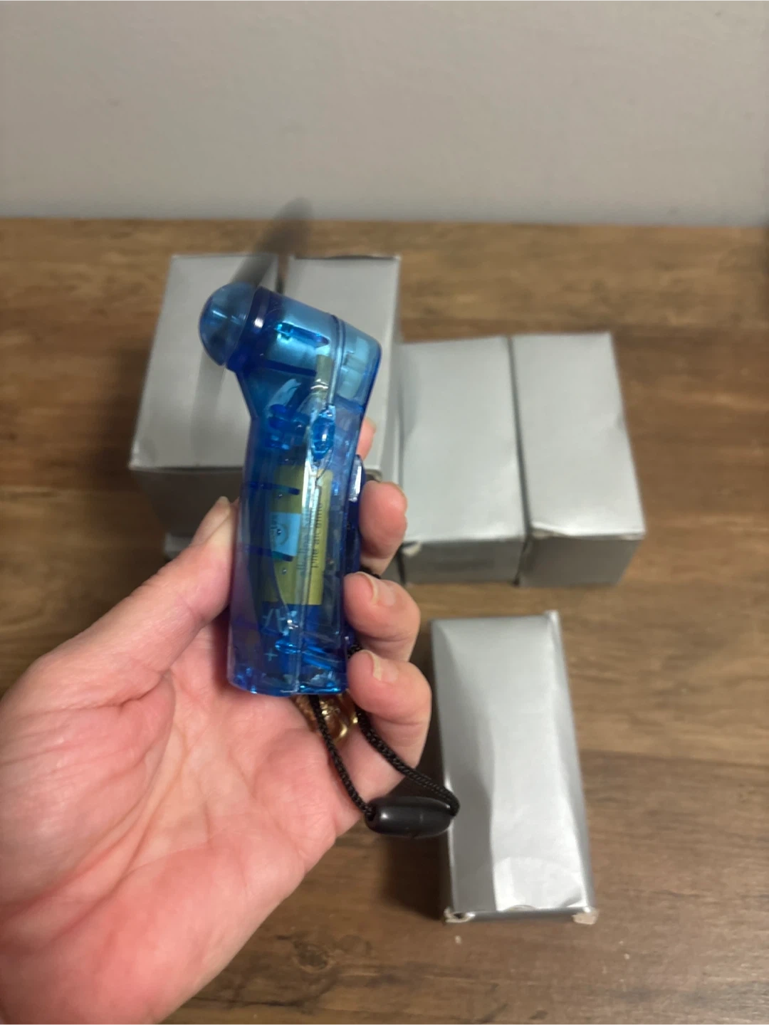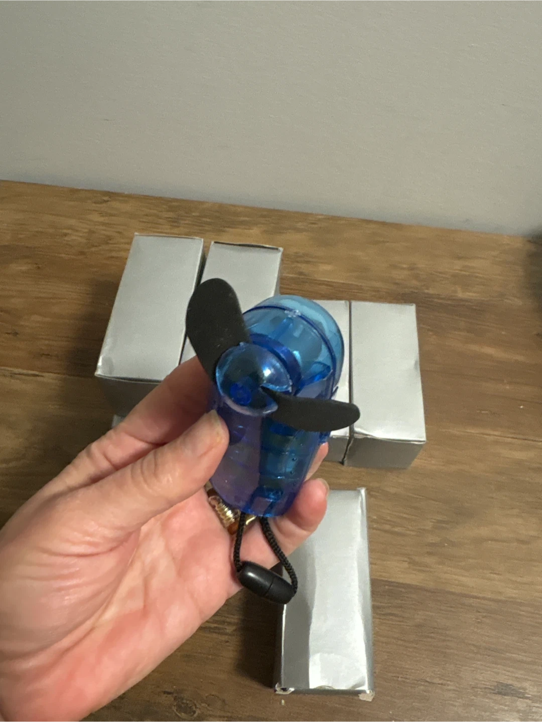 This blue portable mini fan is great for staying cool on the go! It's powered by AA batteries and comes with a lanyard for easy carrying. The fan itself is clear blue plastic. Includes original packaging.