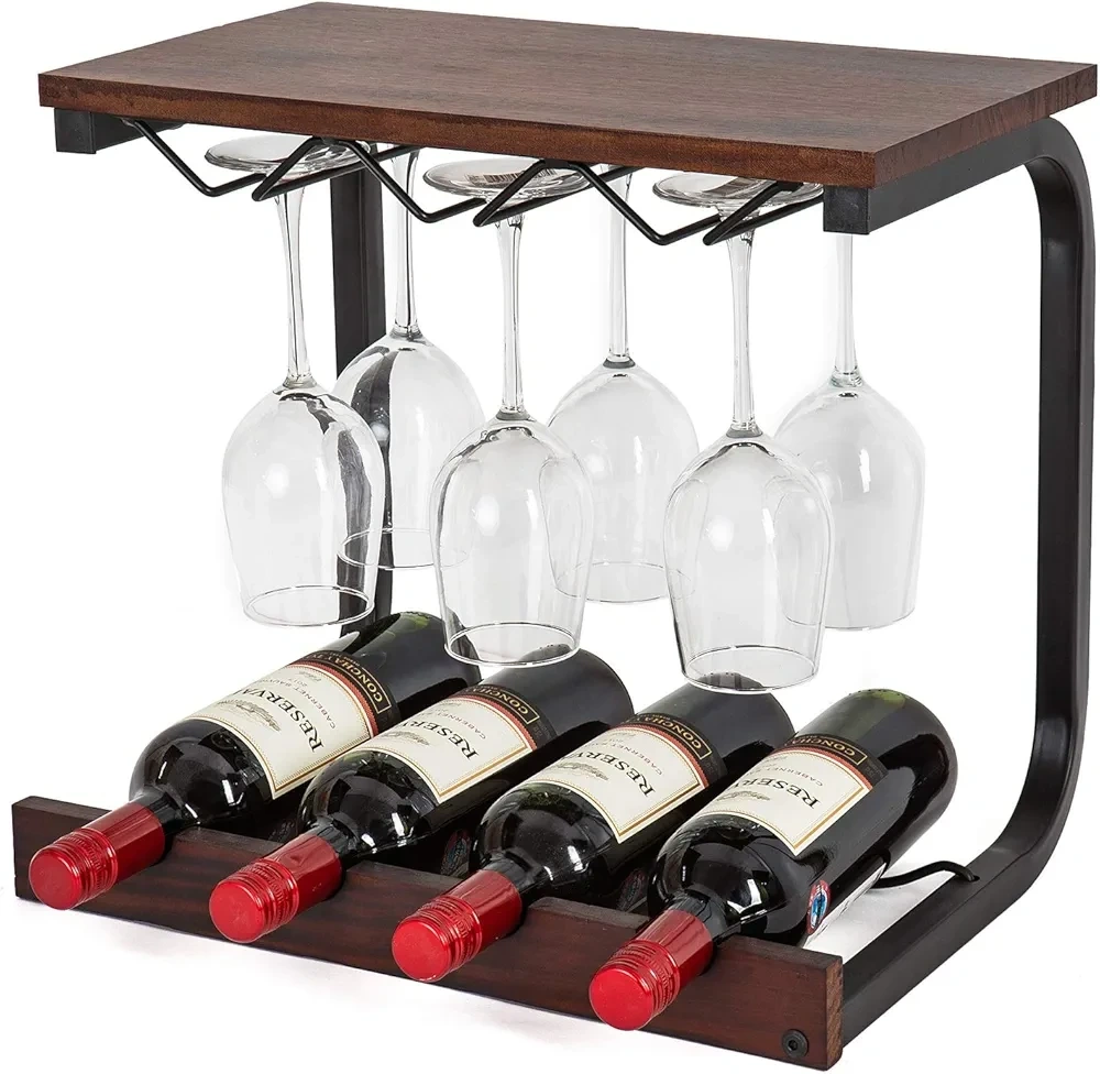 This wine rack holds four bottles of wine and suspends six wine glasses. It's made with a dark wood finish and black metal accents. Great for keeping your wine and glasses organized!