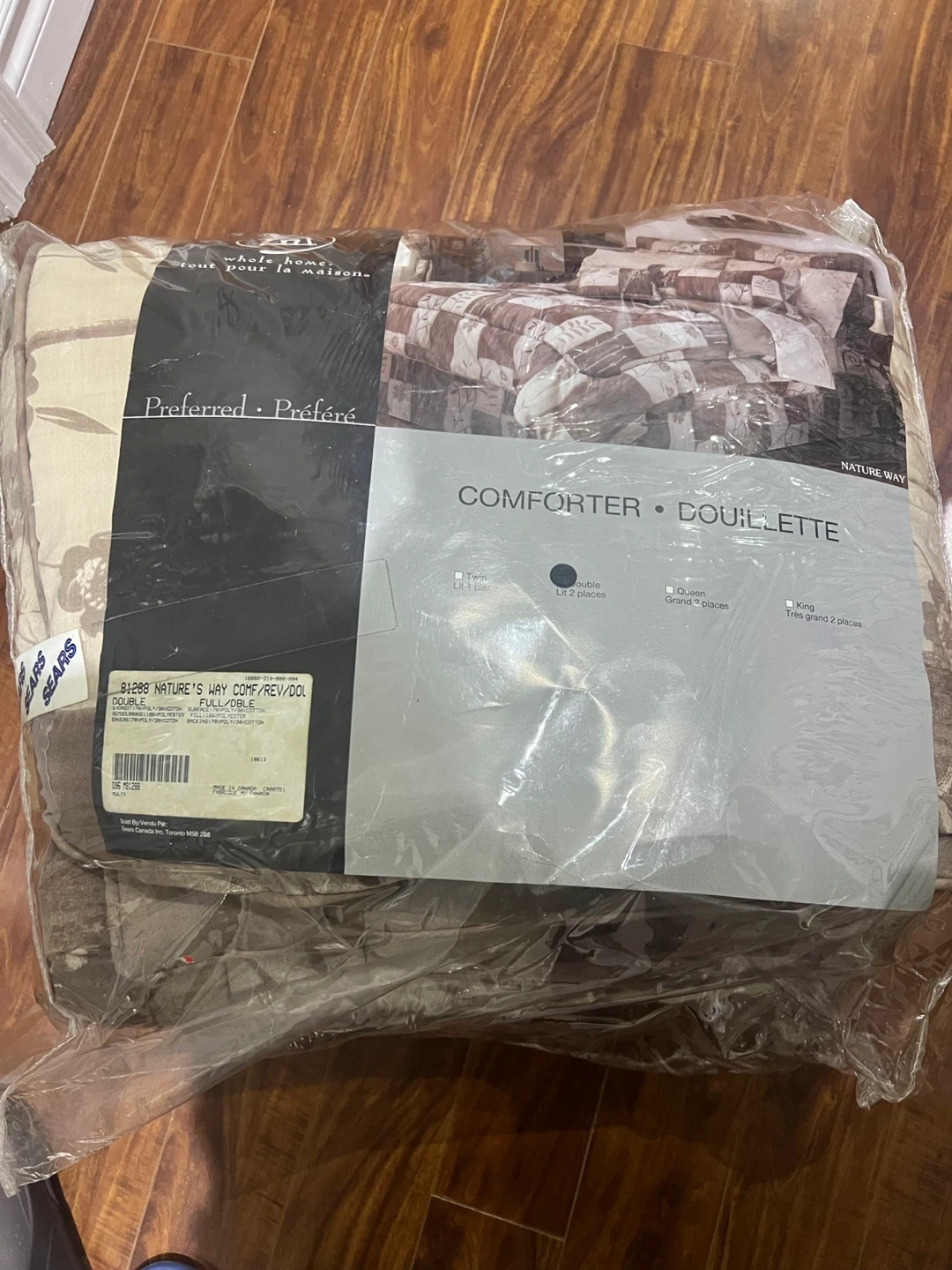 This is a Preferred Nature's Way comforter, size double. It's reversible with a woodland-inspired pattern. Made from 100% cotton shell and polyester fill.