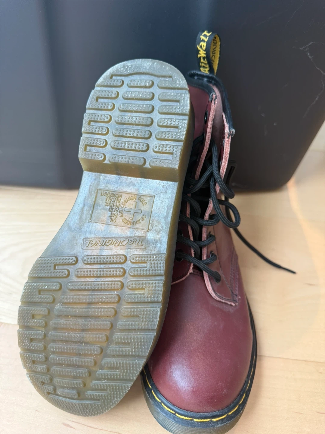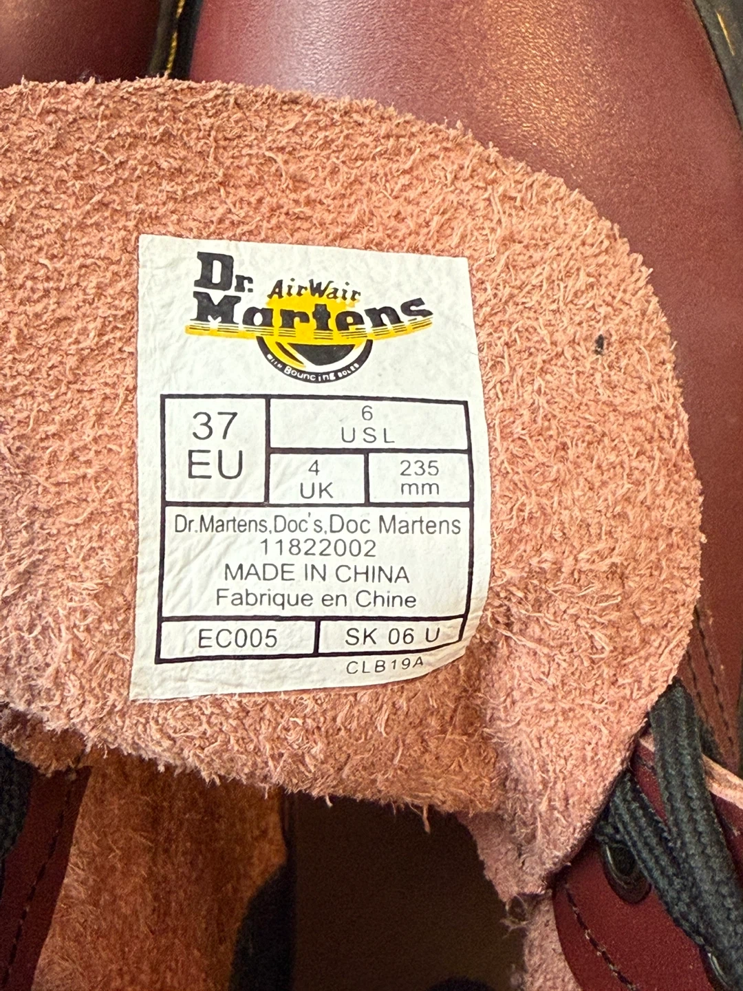 These are burgundy leather Dr. Martens 1460 boots. They're a size EU 37, UK 4, USL 6, and 235mm. Made in China.