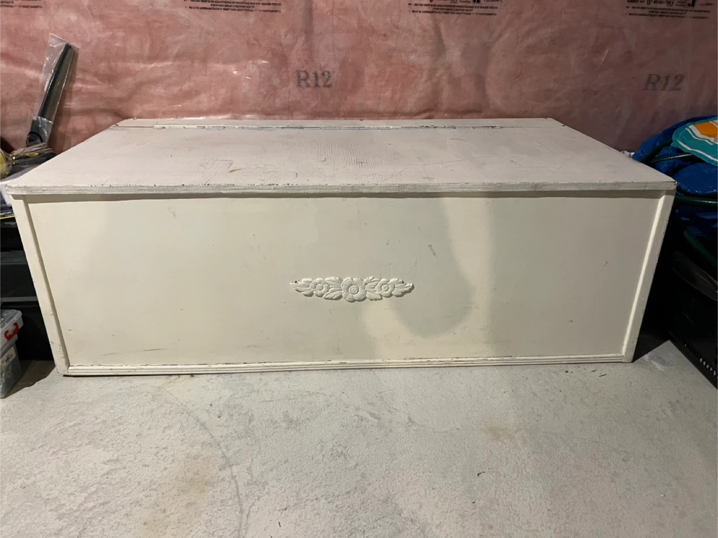 A solid storage bench made of plywood and features a hinged lid for easy access. This chest offers ample space for blankets, toys, tools or other household items. It's perfect for stowing away clutter in a bedroom, living room, or entryway. Can be used as a bench.