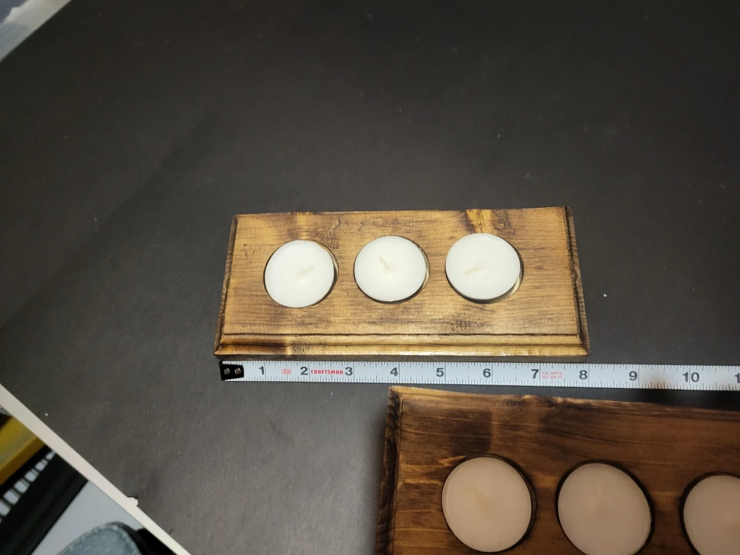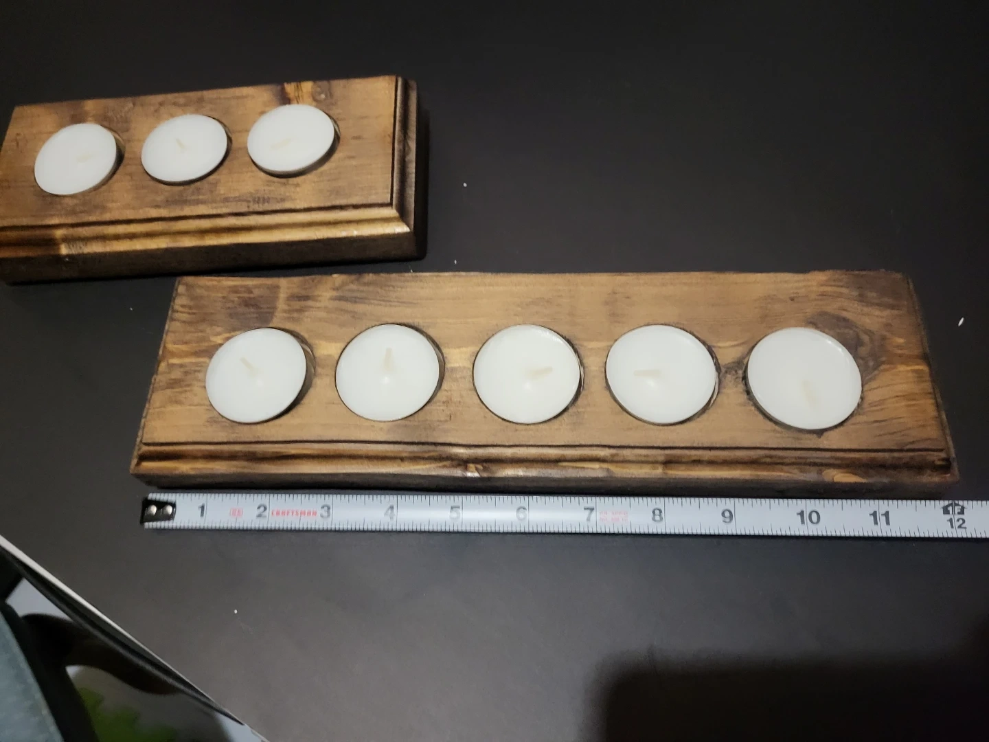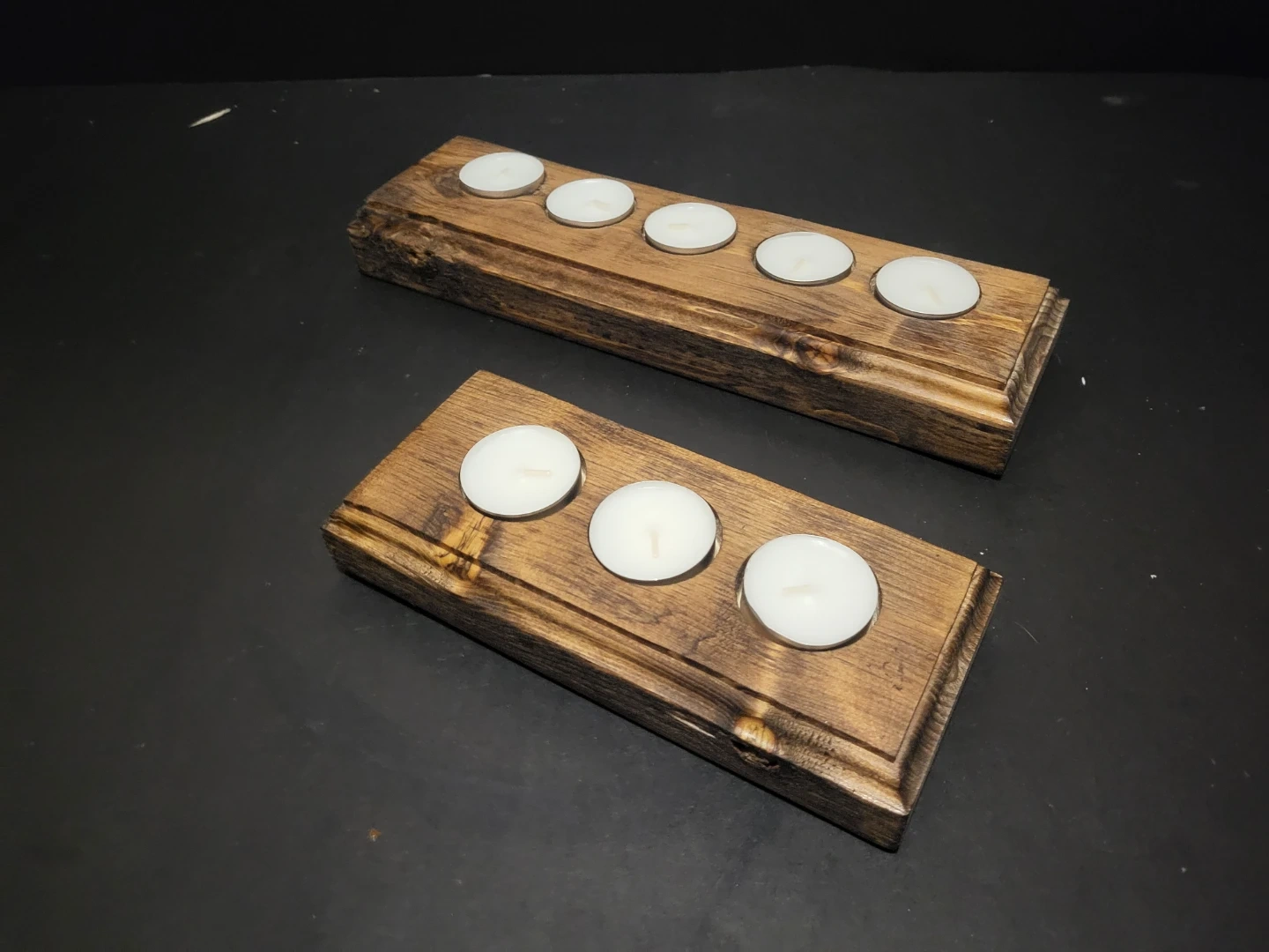 Two handcrafted wooden candle holders. One holds three tea lights, and the other holds five tea lights. These rustic holders are made of stained wood.The large are $4, the small are $3.