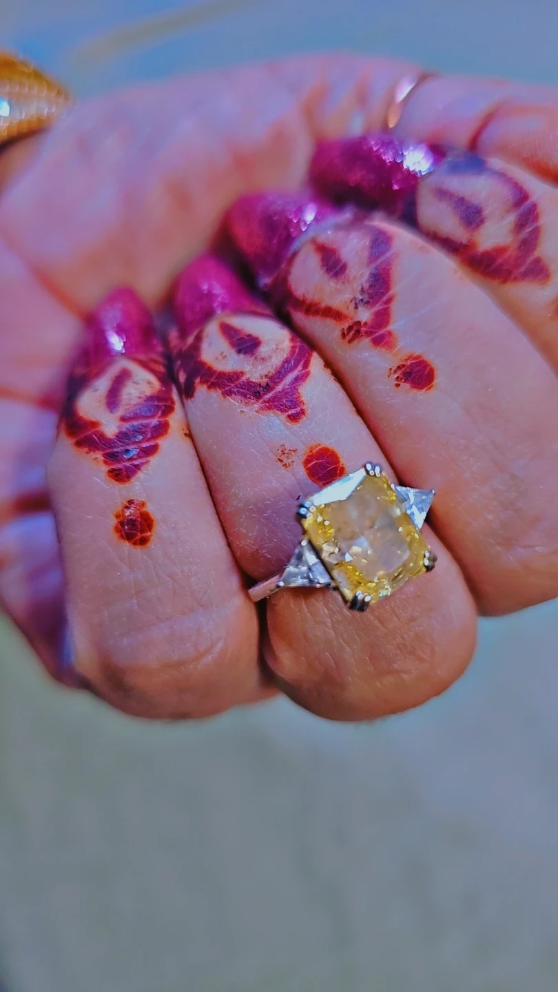 A beautiful engagement ring featuring a radiant-cut yellow centre stone, flanked by two triangular accent stones. The setting appears to be white gold or platinum. This ring is a stunning piece for a special occasion.