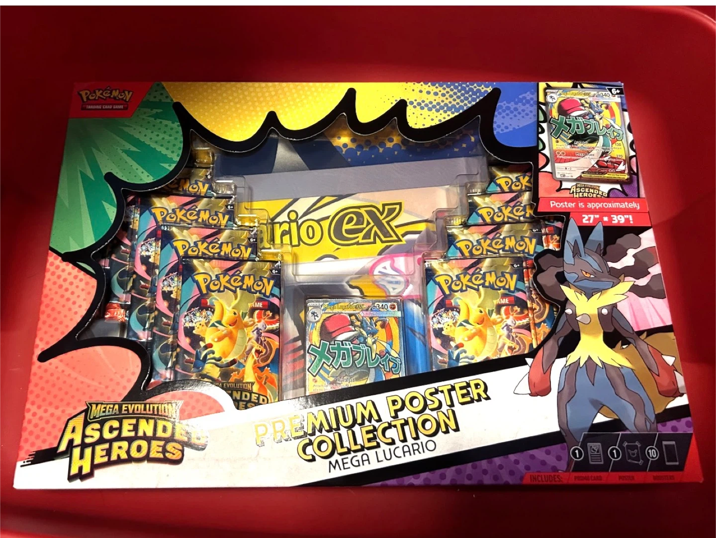 This Pokémon Premium Poster Collection features Mega Lucario. It includes booster packs, a promo card, and a poster that's approximately 27" by 39". This collection is from the Mega Evolution Ascended Heroes series. It's great for collectors and players!