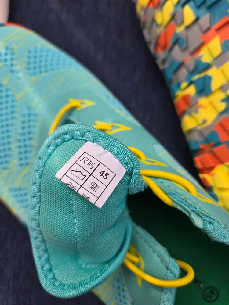 These aqua-coloured shoes are a size 45, which is approximately a US size 11. They come with a handy carrying bag.