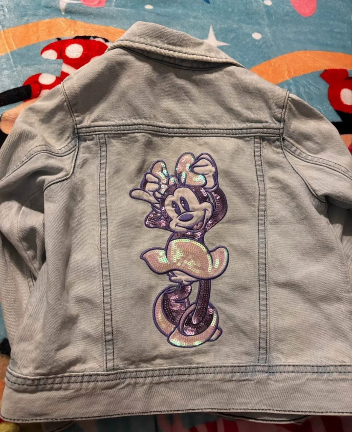 Light wash denim jacket with Minnie Mouse and rainbow patches. Features a sequined Minnie Mouse graphic on the back. Button closure and pockets.