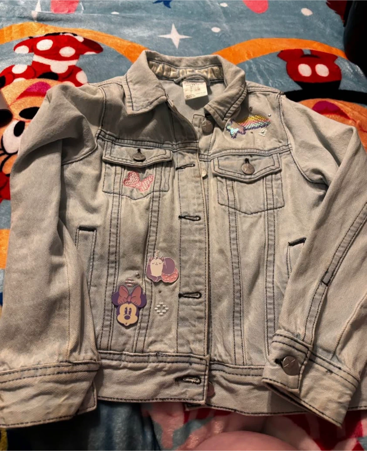 Light wash denim jacket with Minnie Mouse and rainbow patches. Features a sequined Minnie Mouse graphic on the back. Button closure and pockets.