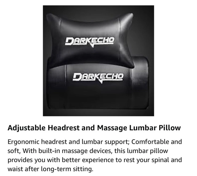 Brand new in box Darkecho gaming chair with an ergonomic design. Features include a quilted design, adjustable headrest, massage lumbar pillow, and padded adjustable armrests. It reclines 155° and rocks 15°. The chair has a highback, 2D adjustable armrests, and a retractable footrest. The PU leather is premium, comfortable, and easy to clean. The USB-powered lumbar pillow offers massage function to reduce fatigue. The chair offers multi-point support for comfort during gaming or work. It swivels 360° and is height adjustable. The sturdy metal frame and 5-point wheelbase ensure stability. Upgraded PU casters roll smoothly and protect floors. SGS and BIFMA certified gas cylinder. Maximum weight capacity is 300 lbs. Easy to assemble with included instructions. If the ad is up, it's available. Discount for multiple purchases!