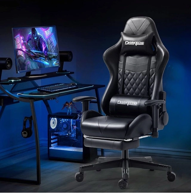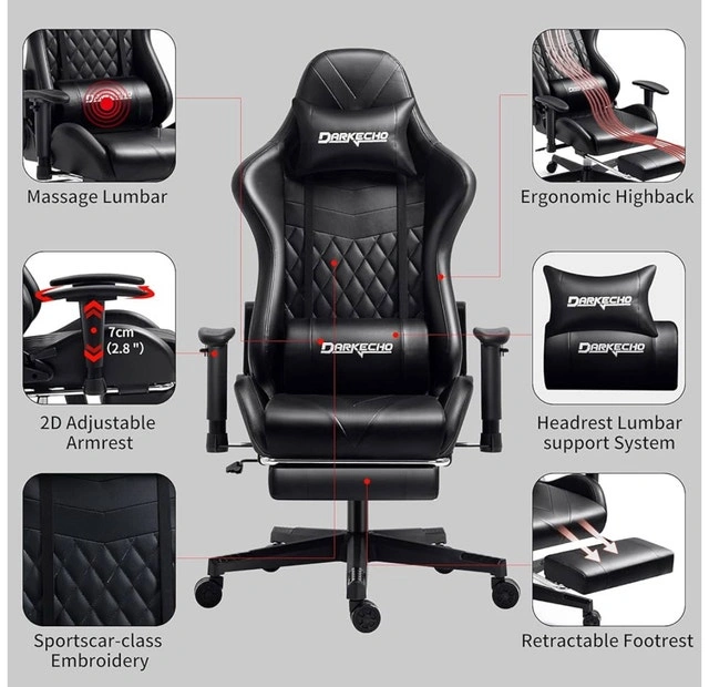 Brand new in box Darkecho gaming chair with an ergonomic design. Features include a quilted design, adjustable headrest, massage lumbar pillow, and padded adjustable armrests. It reclines 155° and rocks 15°. The chair has a highback, 2D adjustable armrests, and a retractable footrest. The PU leather is premium, comfortable, and easy to clean. The USB-powered lumbar pillow offers massage function to reduce fatigue. The chair offers multi-point support for comfort during gaming or work. It swivels 360° and is height adjustable. The sturdy metal frame and 5-point wheelbase ensure stability. Upgraded PU casters roll smoothly and protect floors. SGS and BIFMA certified gas cylinder. Maximum weight capacity is 300 lbs. Easy to assemble with included instructions. If the ad is up, it's available. Discount for multiple purchases!