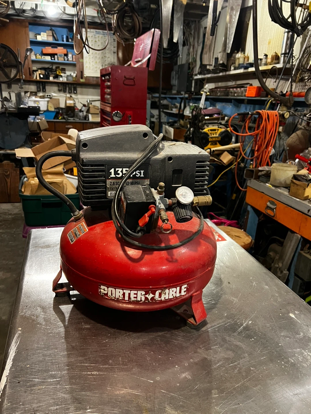 Porter-Cable 2.6 SCFM air compressor with a 2/2 gallon tank. It's oil-free and reaches 135 PSI. This compact compressor is great for various DIY tasks.