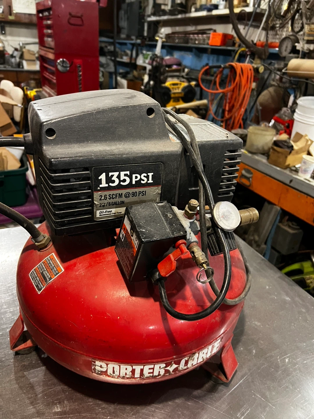 Porter-Cable 2.6 SCFM air compressor with a 2/2 gallon tank. It's oil-free and reaches 135 PSI. This compact compressor is great for various DIY tasks.