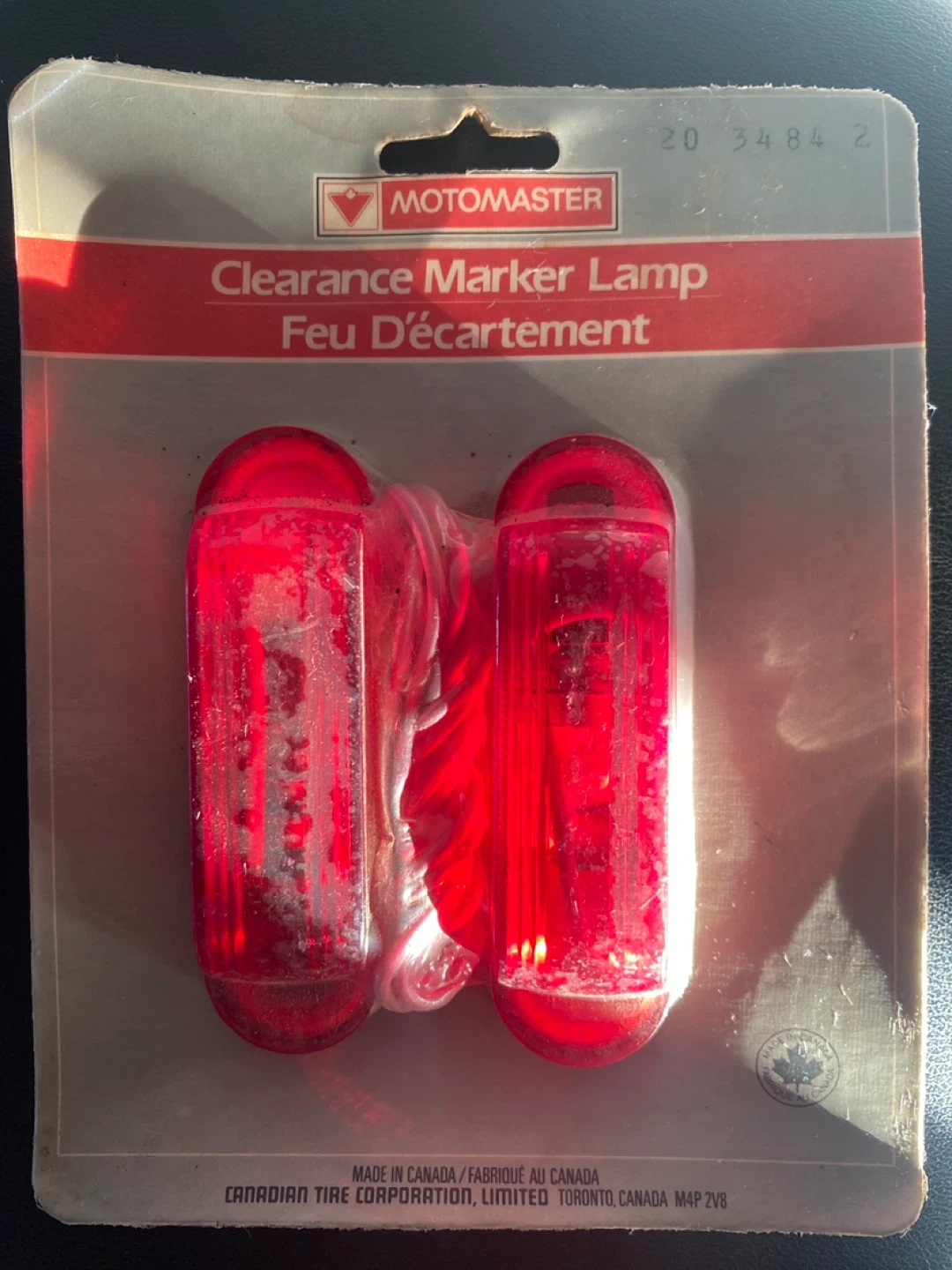 Brand new pair of red Motomaster clearance marker lamps still in the original packaging. These are made in Canada by the Canadian Tire Corporation.