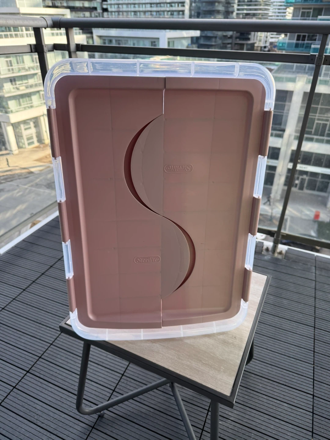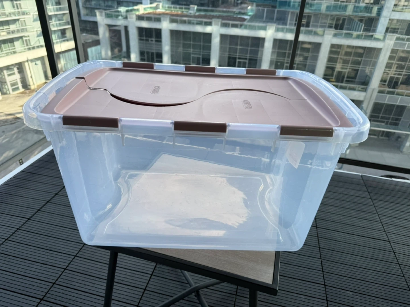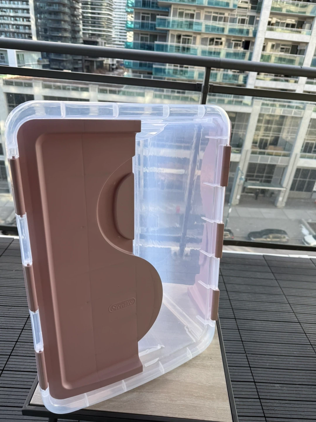 This is a Sterilite 48 Qt clear storage bin with a brown lid. It's made of durable plastic and includes latches to secure the lid.
