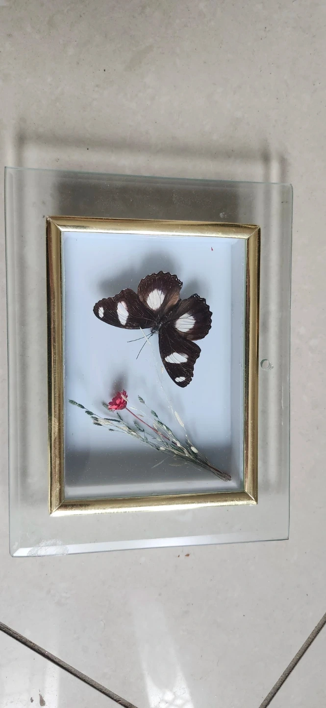 This is a preserved butterfly specimen mounted in a clear frame with a small dried flower. The frame has gold trim and clear glass sides. It's a unique decorative piece for any space.