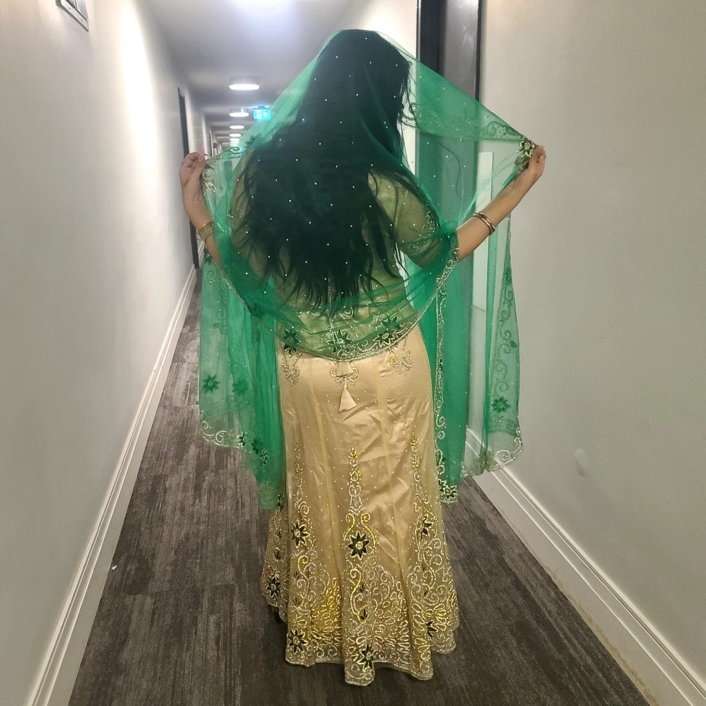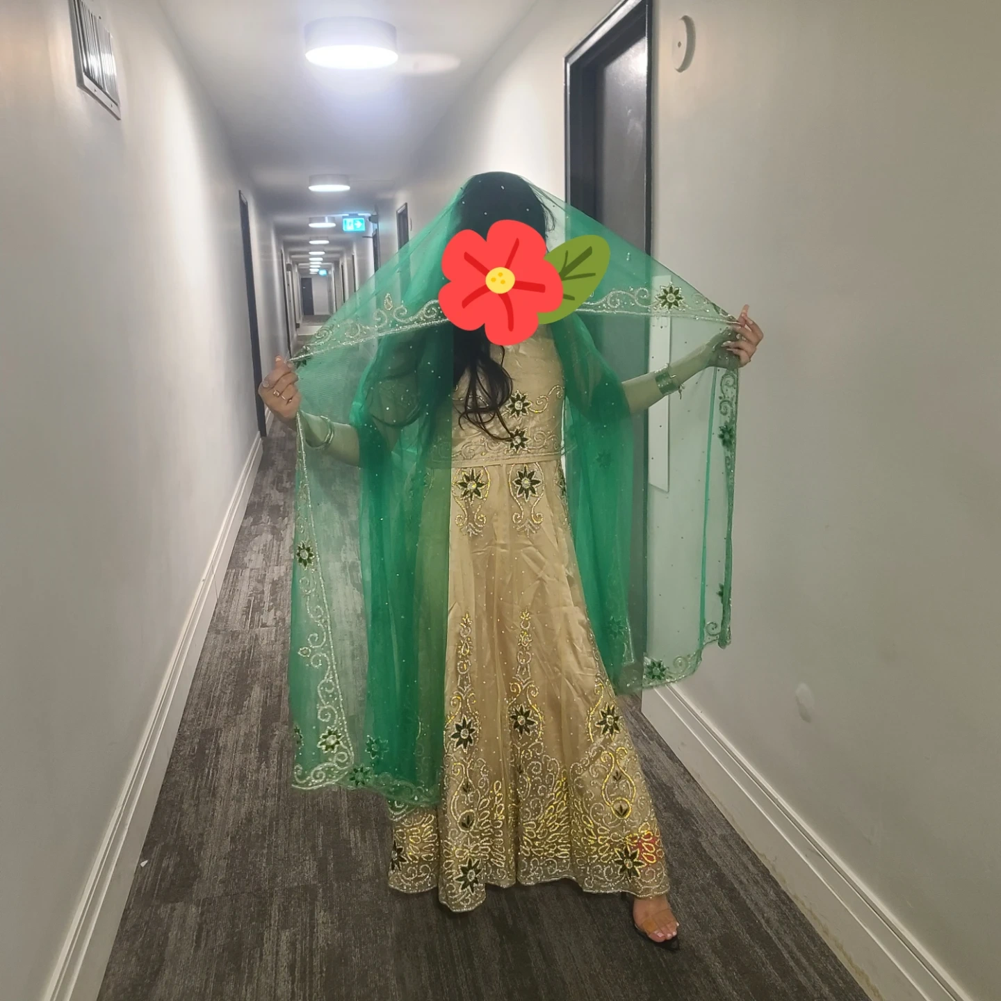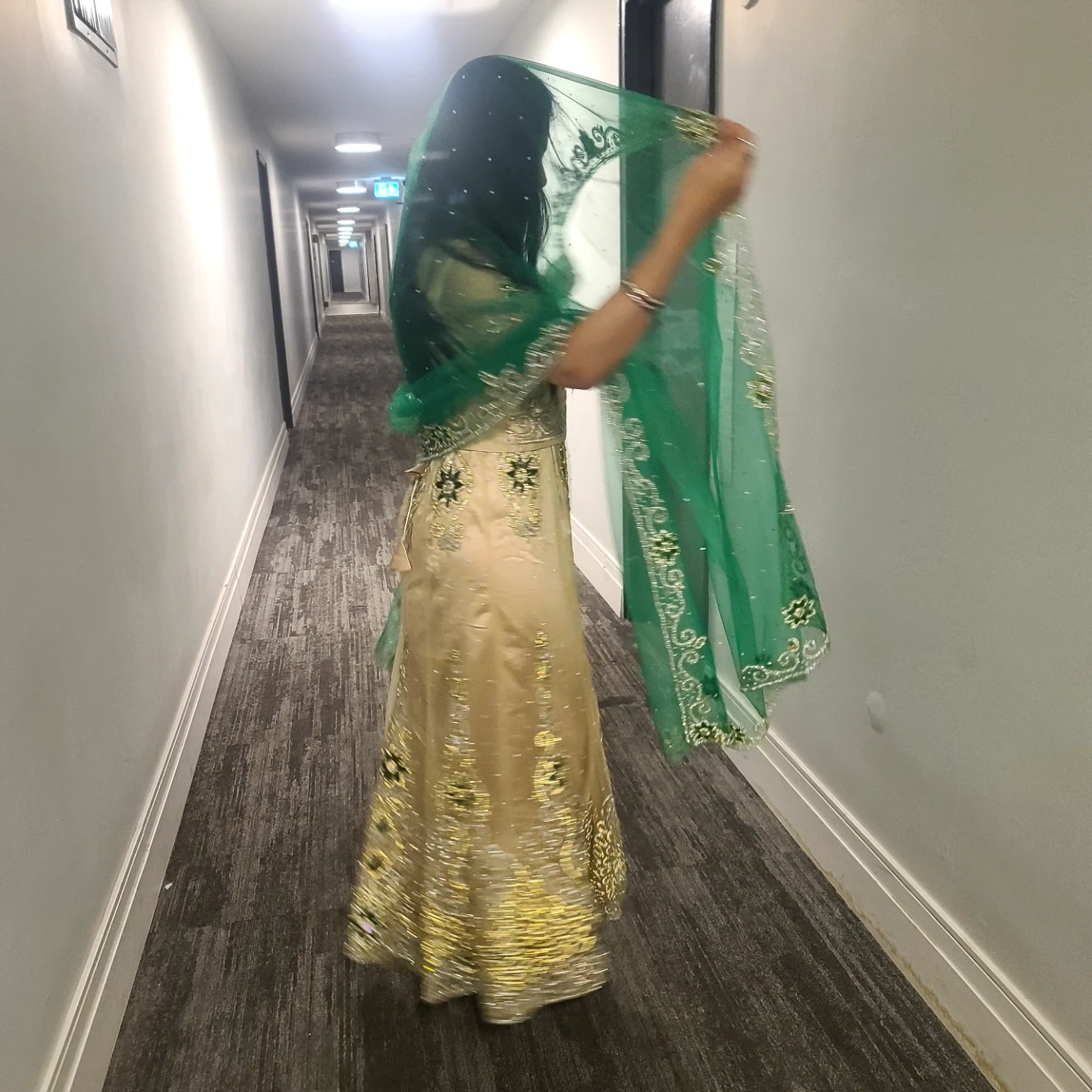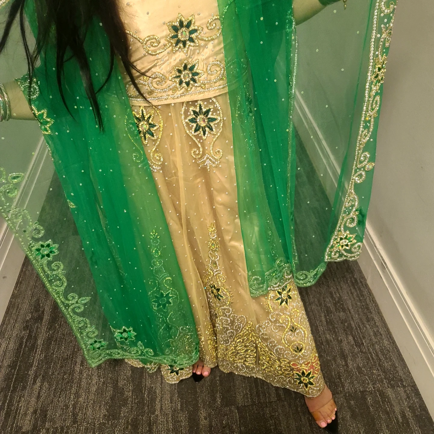 Beautiful lehenga choli set with intricate embroidery and a matching dupatta. Perfect for special occasions! The set features a gold-toned skirt and top with green and gold embroidery, paired with a sheer green dupatta. It's in great condition and ready to wear