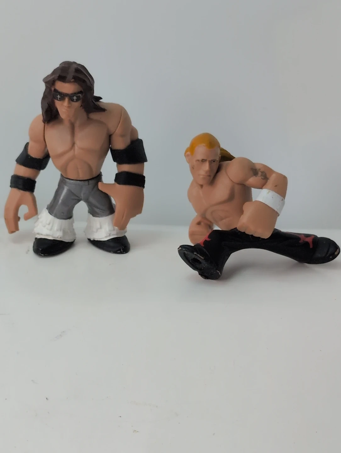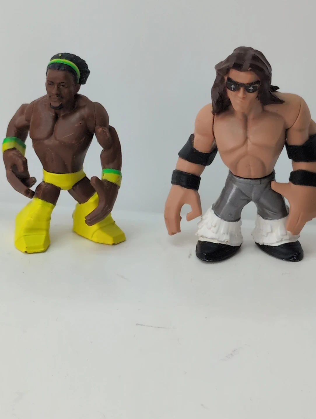 A set of four WWE action figures featuring The Undertaker, Booker T, Edge, and John Cena. These figures are made of plastic and are approximately 4-5 inches tall. They're great for any wrestling fan's collection!