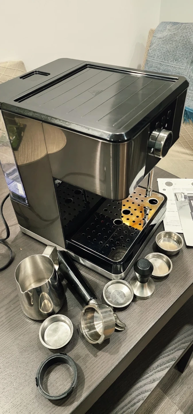PADERNO Espresso Maker with a 20 bar pump. It's black stainless steel and comes with a milk frothing pitcher and tamper. This machine is ready to make your favourite coffee drinks!