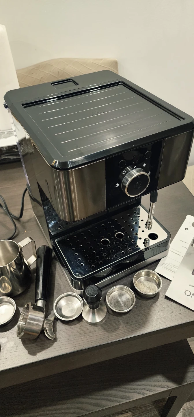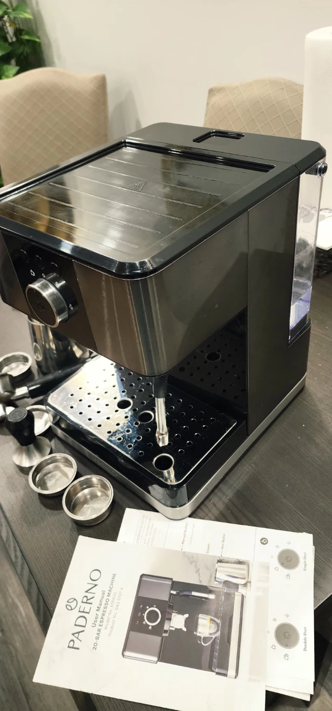 PADERNO Espresso Maker with a 20 bar pump. It's black stainless steel and comes with a milk frothing pitcher and tamper. This machine is ready to make your favourite coffee drinks!