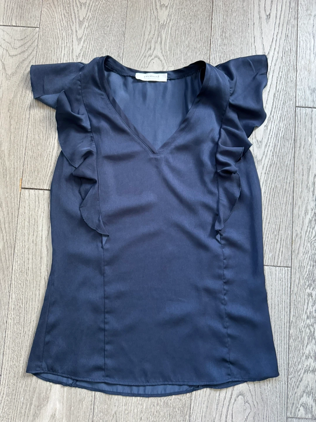 This navy blue blouse from has cute flutter sleeves with ruffles. It's made of a silky material and features a V-neckline. It's a stylish top perfect for dressing up or down!