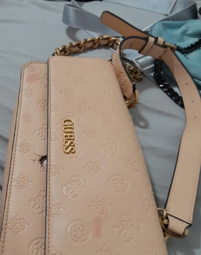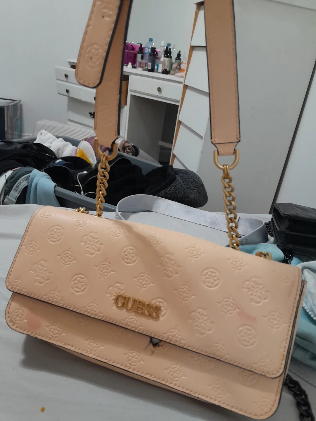 🥕A Guess shoulder bag in a light pink colour with embossed detailing. It features a chain strap and a flap closure. Some minor marks present on the bag.
