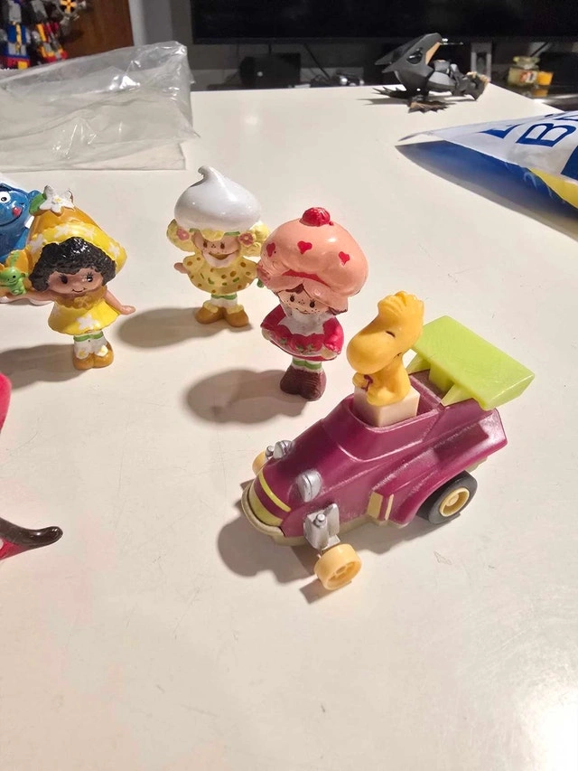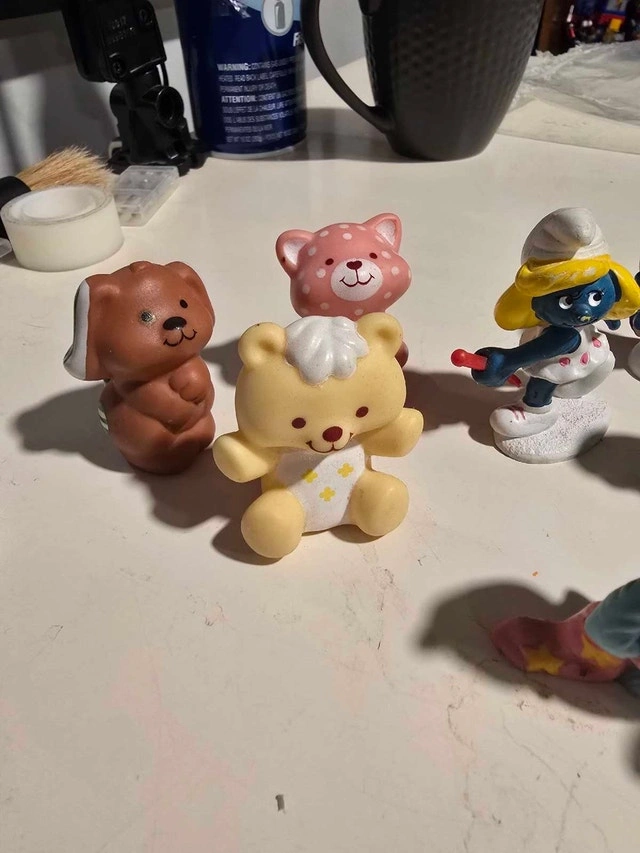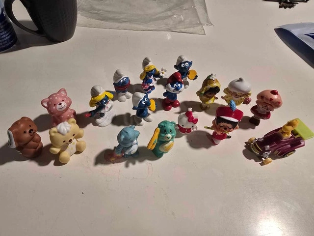 Selling a mixed lot of vintage toy figurines including Smurfs, Care Bears, Strawberry Shortcake, and more. These pre-loved figures are great for collectors or for nostalgic play. They have been kept in good condition, please see photos for details. I think these figurines are super fun and would look great displayed! If the ad is up, yes, it is still available! Cash accepted.