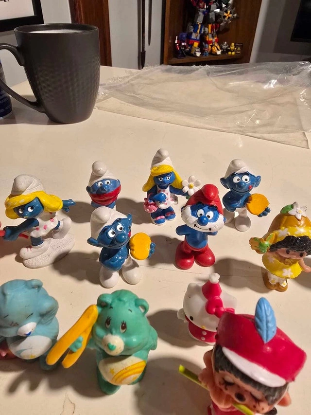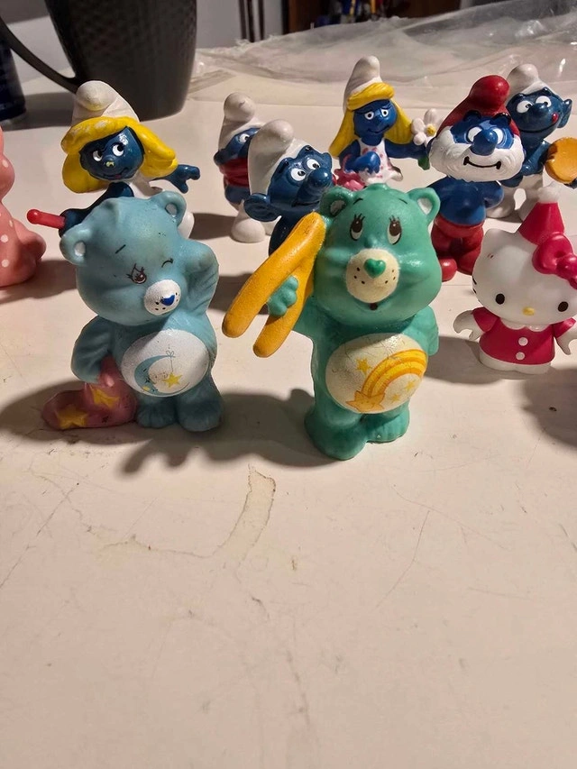 Selling a mixed lot of vintage toy figurines including Smurfs, Care Bears, Strawberry Shortcake, and more. These pre-loved figures are great for collectors or for nostalgic play. They have been kept in good condition, please see photos for details. I think these figurines are super fun and would look great displayed! If the ad is up, yes, it is still available! Cash accepted.