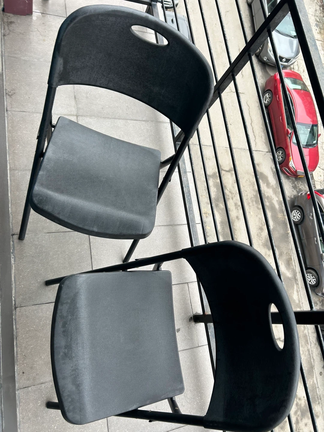 Selling a set of two black folding chairs. They're made of durable plastic and metal. These chairs are great for extra seating at events or for small spaces. Easy to store when not in use!