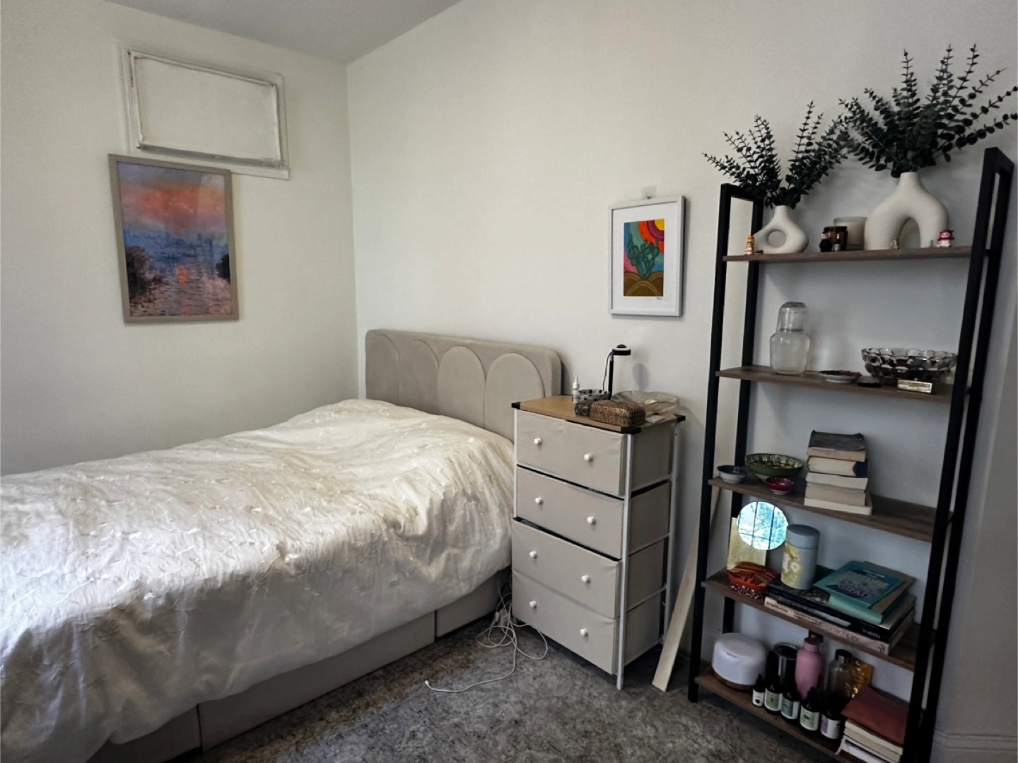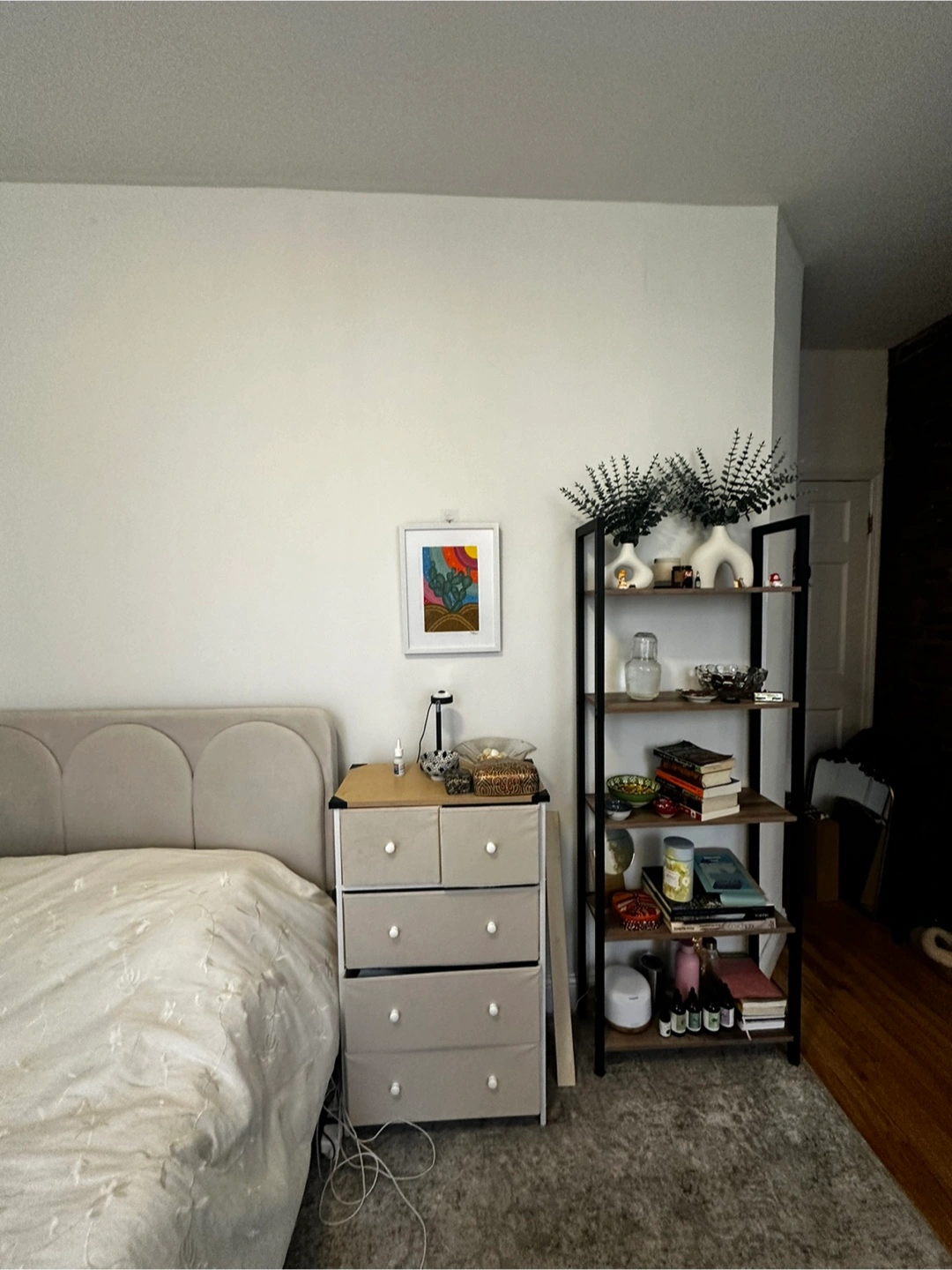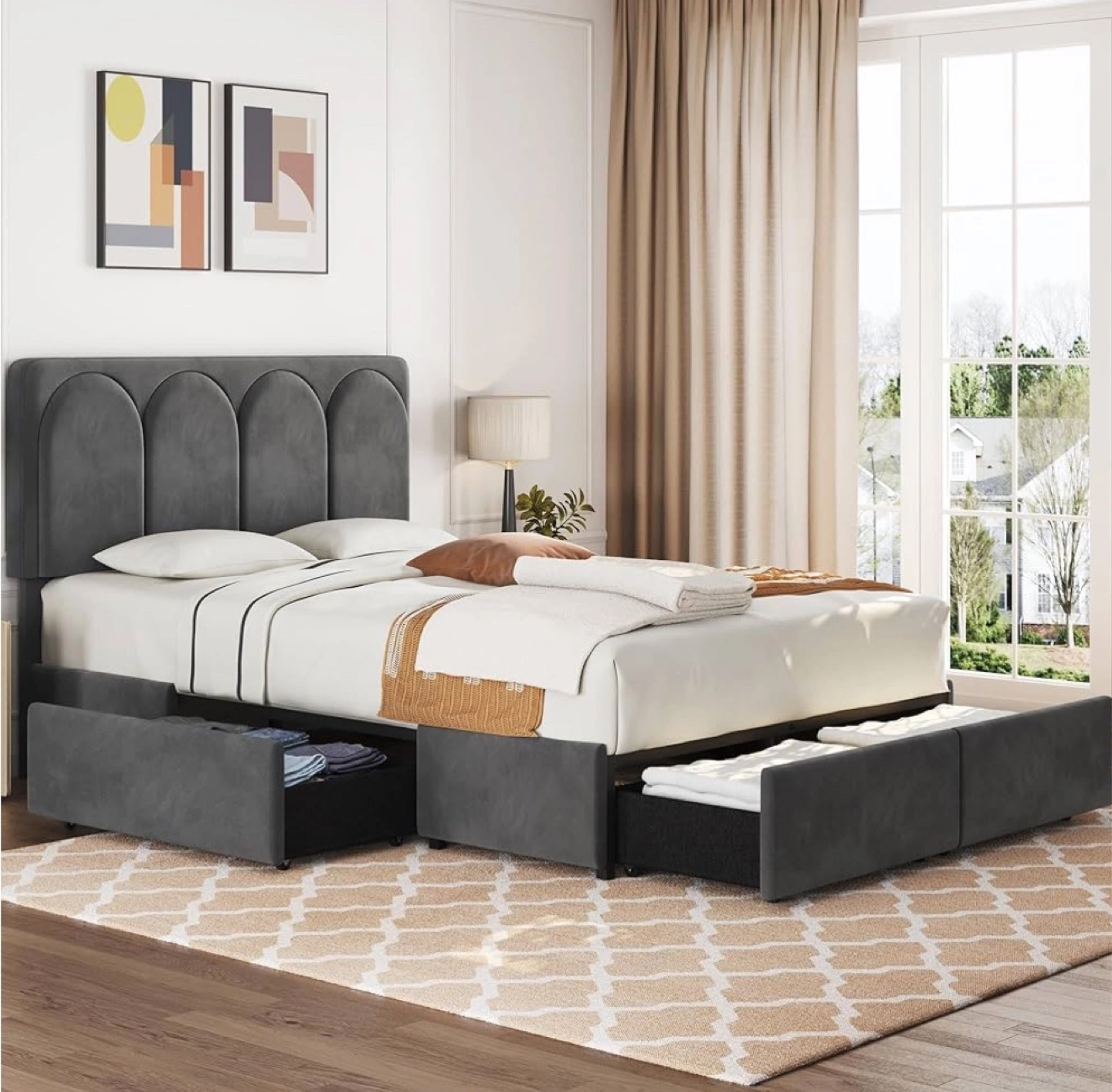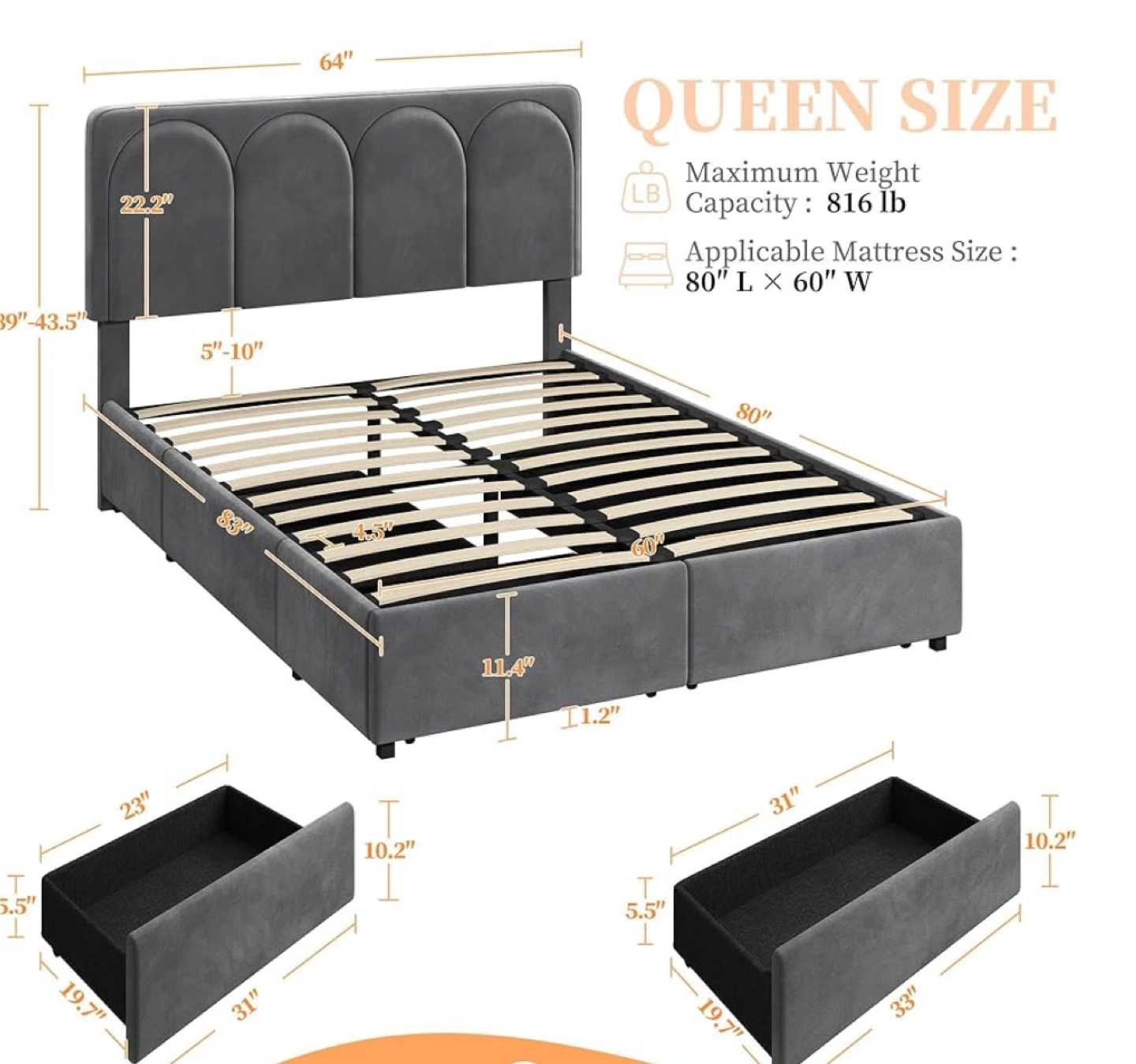 Selling a queen size platform bed! It features a headboard with an arched design and convenient storage drawers.