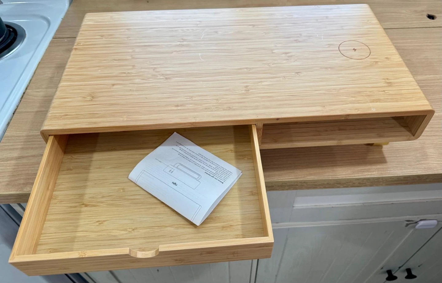 This bamboo laptop stand offers an organized workspace. It's made of natural bamboo and includes a convenient drawer for storage. The stand also features two USB ports for charging devices. It's great for elevating your monitor or laptop! I don't have the power adapter.
