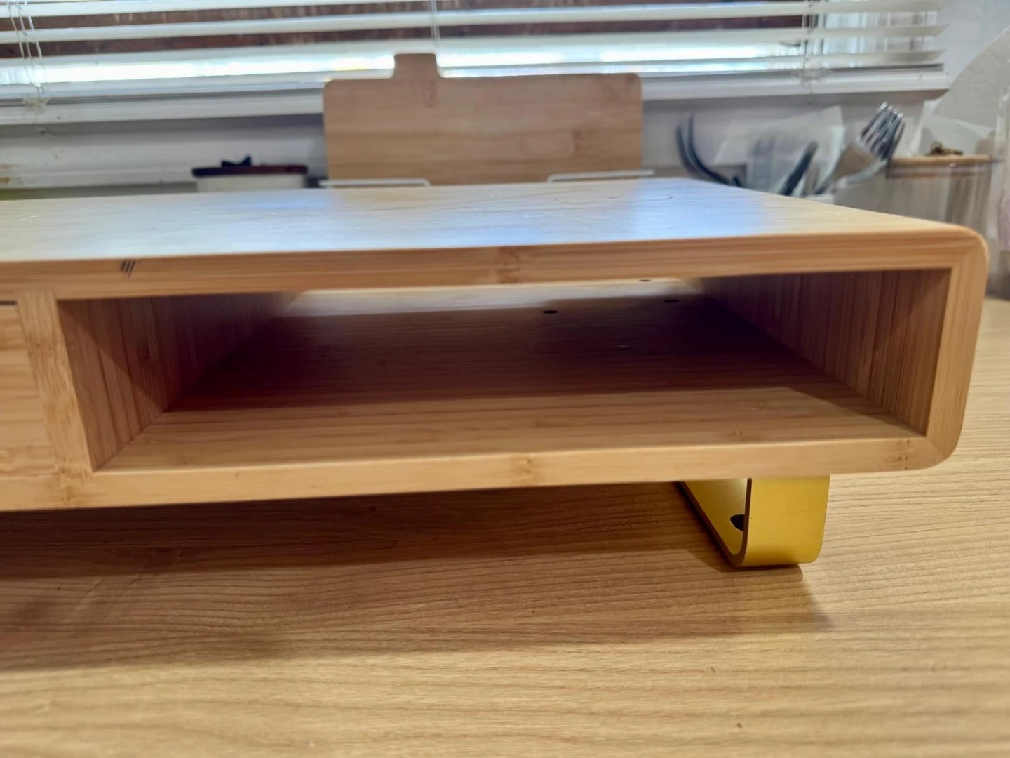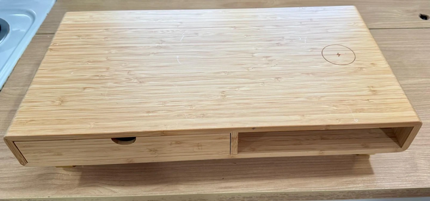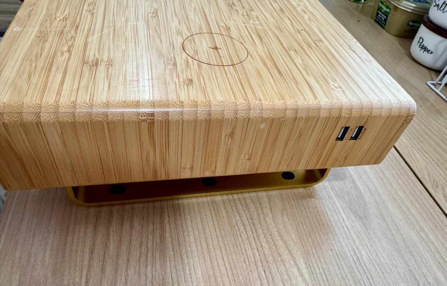 This bamboo laptop stand offers an organized workspace. It's made of natural bamboo and includes a convenient drawer for storage. The stand also features two USB ports for charging devices. It's great for elevating your monitor or laptop! I don't have the power adapter.