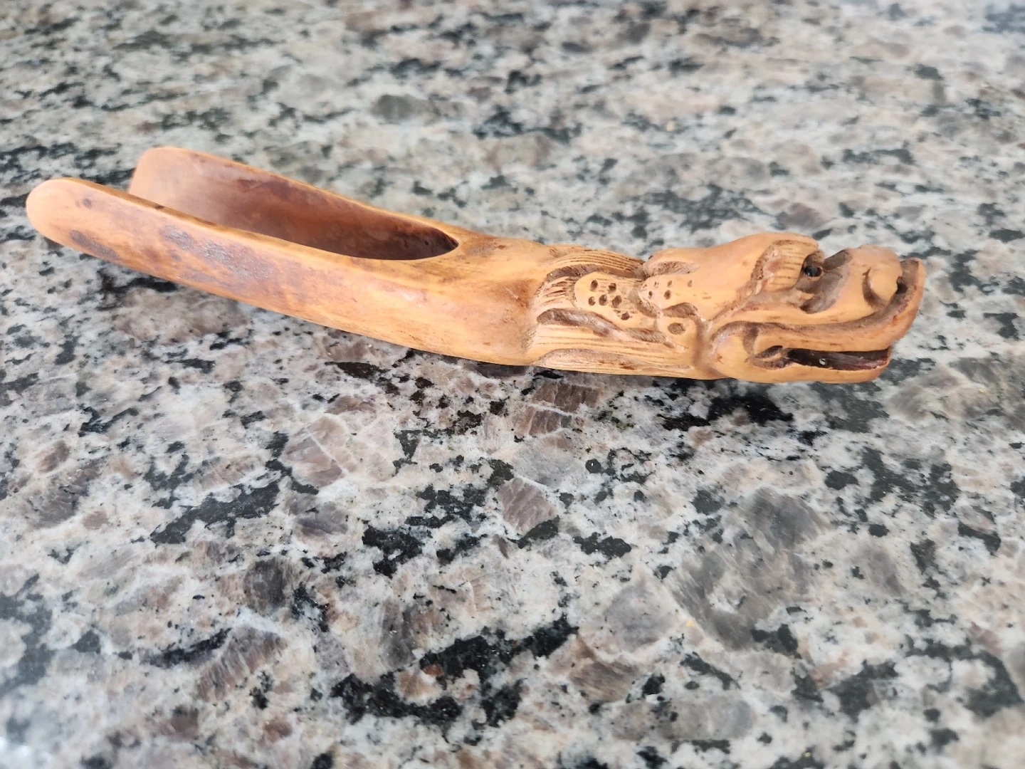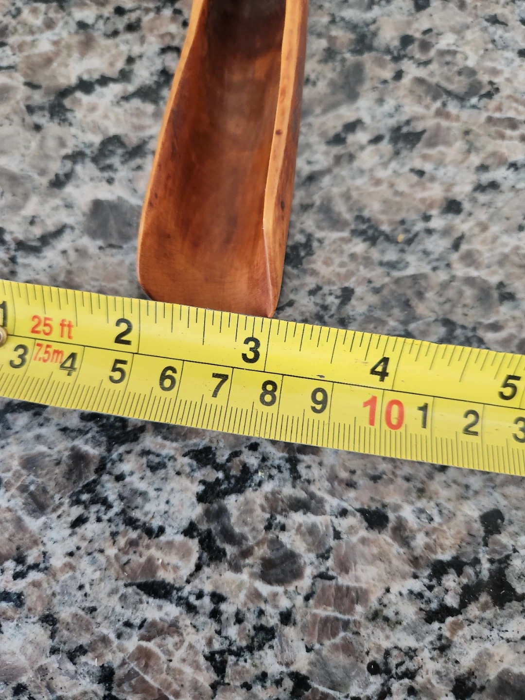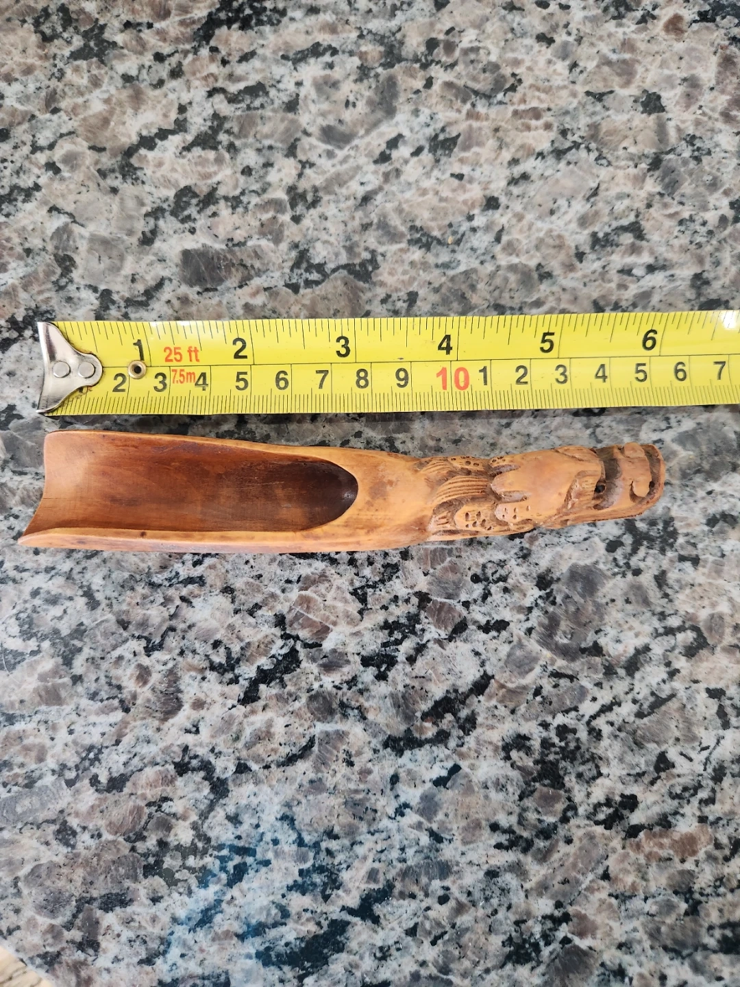 This is a unique wooden scoop carved with a dragon design. It measures about 6 inches long. Its artisanal look makes it a neat display piece for any tea or coffee lover!