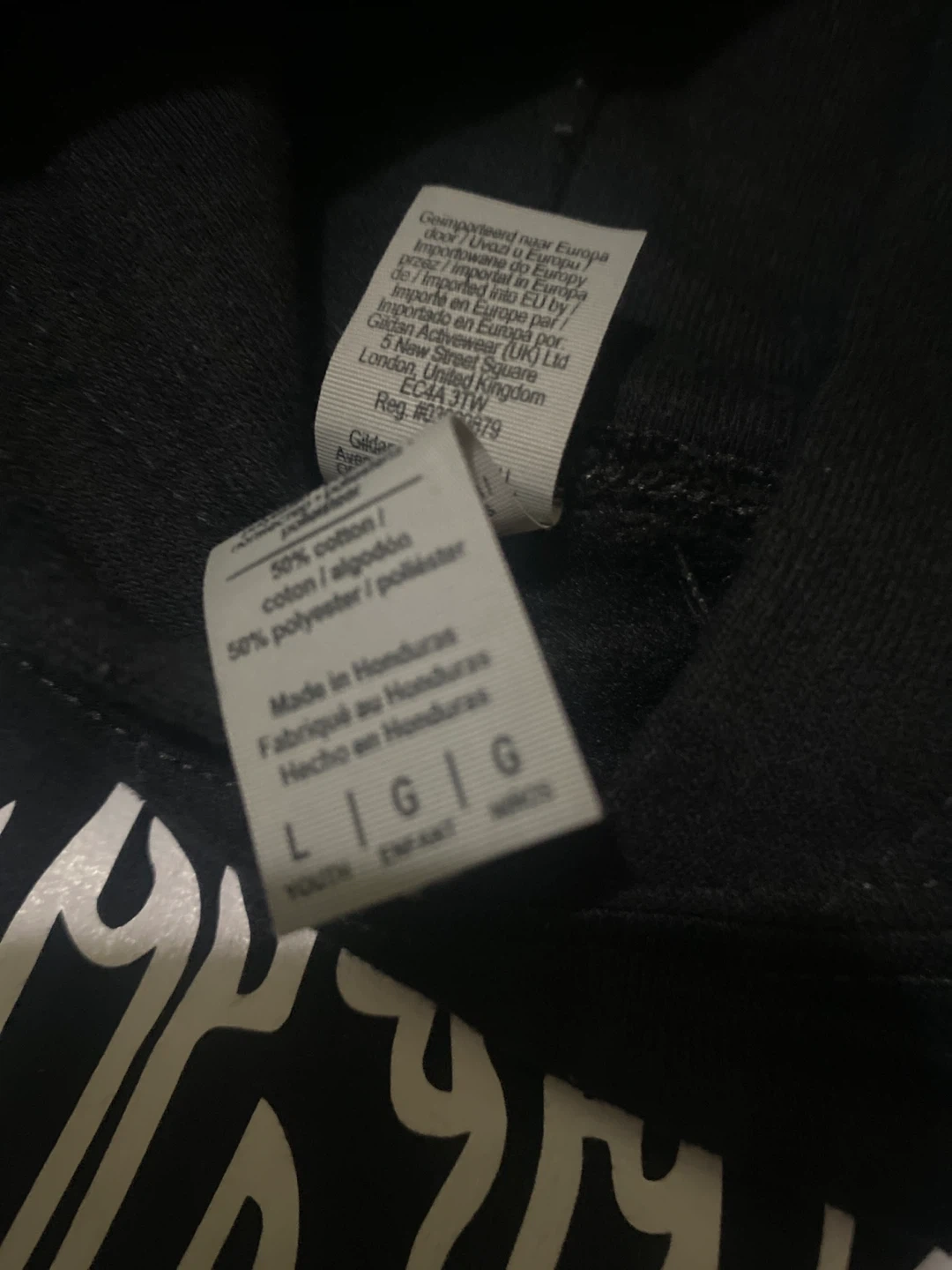 Black Thrasher Magazine hoodie with flame graphics on sleeves. Cotton/polyester blend. Size L, fits Youth.