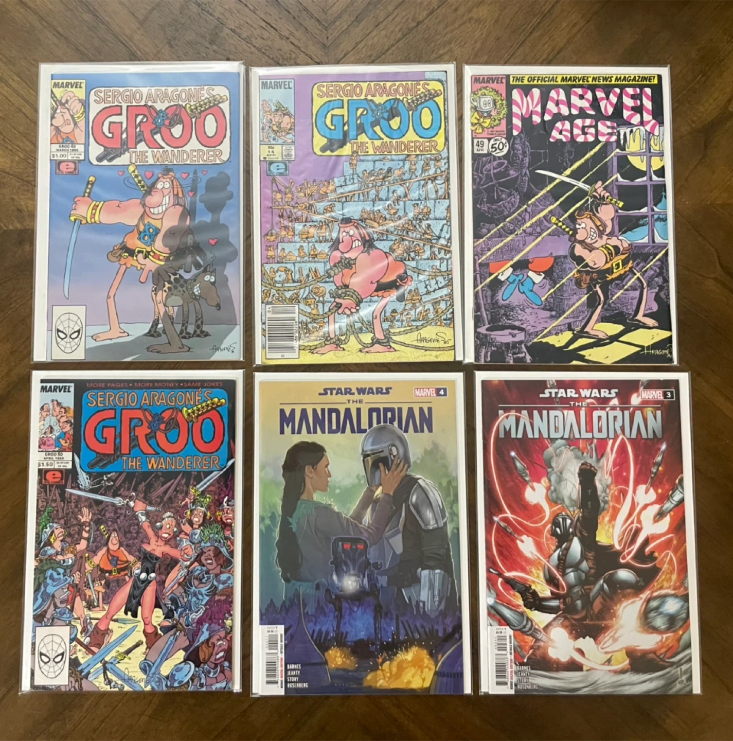 This lot includes Sergio Aragonés Groo The Wanderer comics issues 45 and 50, plus Marvel Age issue 49 and Star Wars The Mandalorian comics issues 3 and 4. Great for collectors!