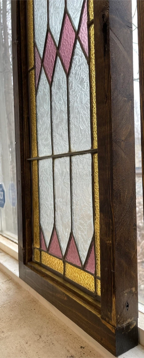 One restored vintage stained glass window panel is available! It features a beautiful design with pink, amber, and clear glass, in a dark wood frame. Perfect for adding a touch of vintage charm to your home