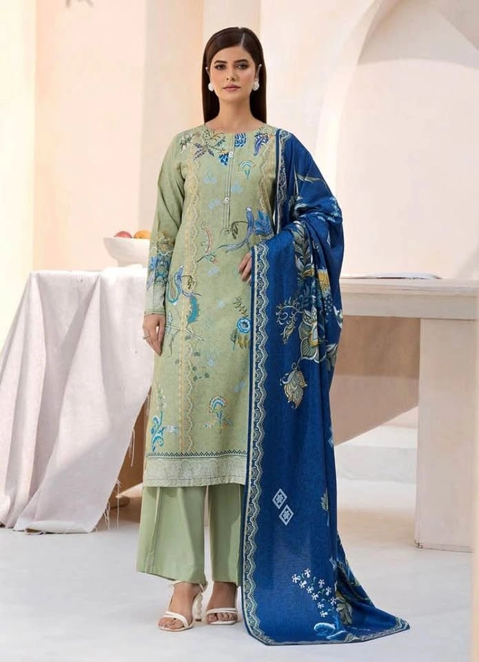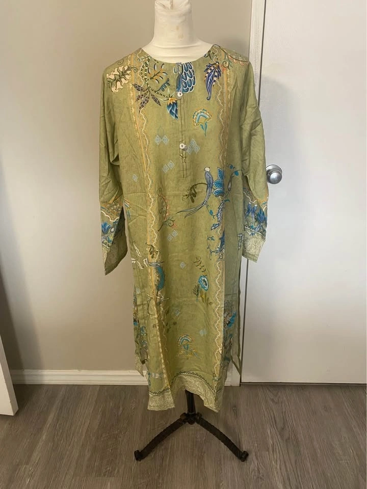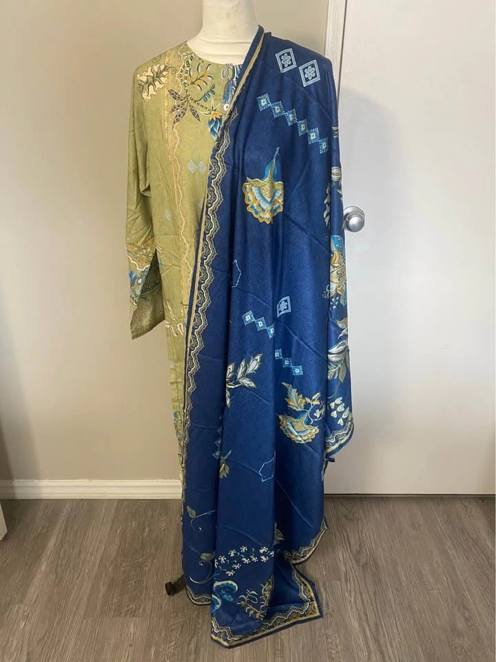 Selling a brand new Pakistani 3-piece linen suit. Size Medium (chest- 20.5). Features a light green long top with blue and floral patterns, matching green pants, and a vibrant blue dupatta with floral designs and a cool border. Feel free to message if you have any questions!