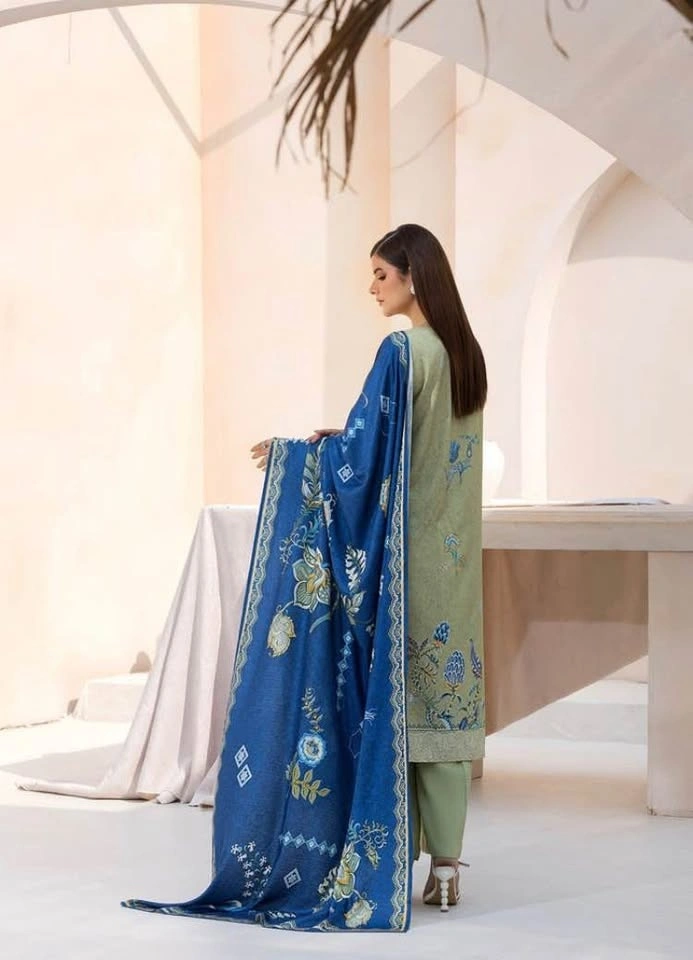 Selling a brand new Pakistani 3-piece linen suit. Size Medium (chest- 20.5). Features a light green long top with blue and floral patterns, matching green pants, and a vibrant blue dupatta with floral designs and a cool border. Feel free to message if you have any questions!