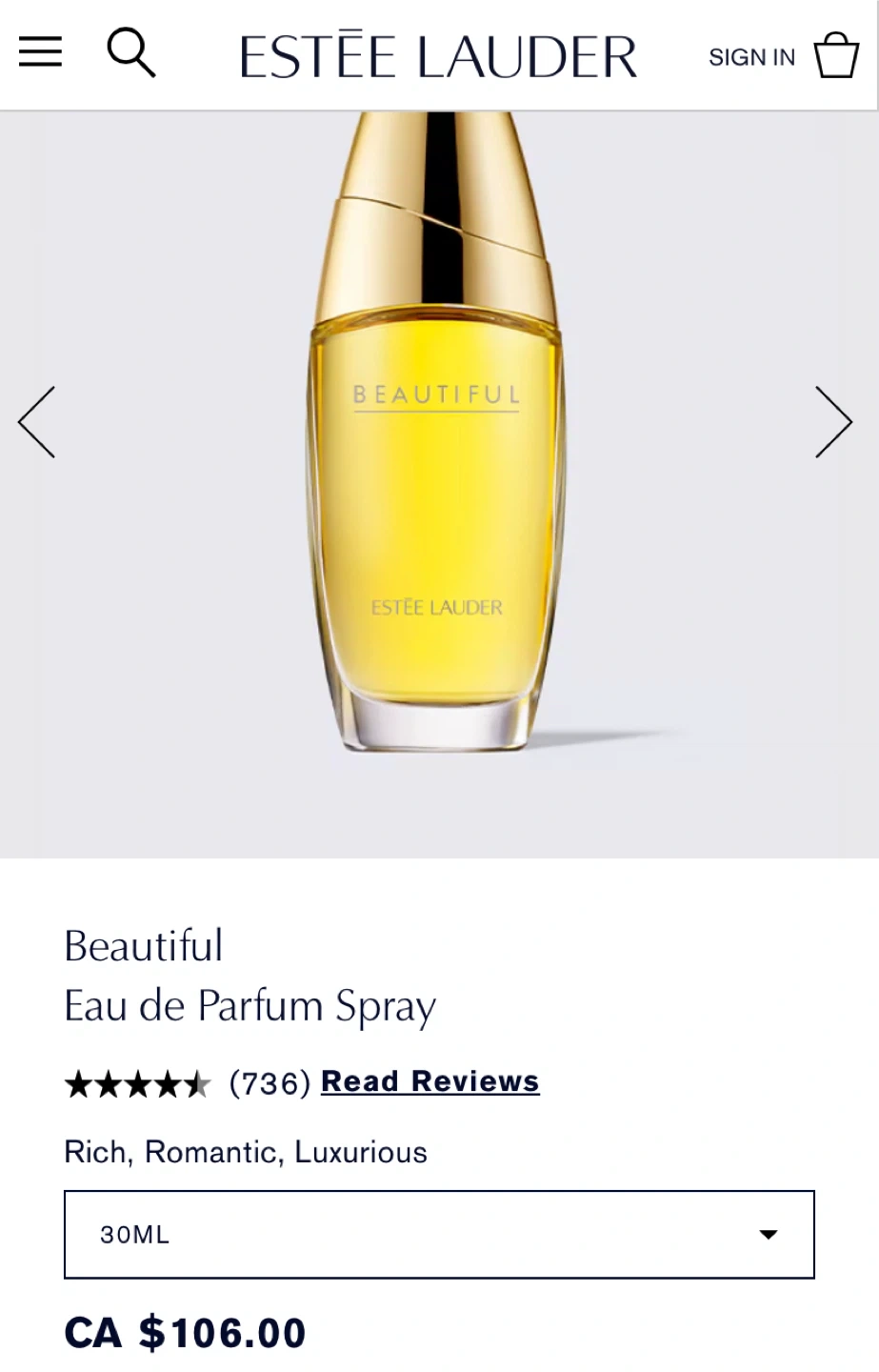 Estée Lauder Beautiful Eau de Parfum Spray. This is a 30ML bottle. It's described as rich, romantic, and luxurious.