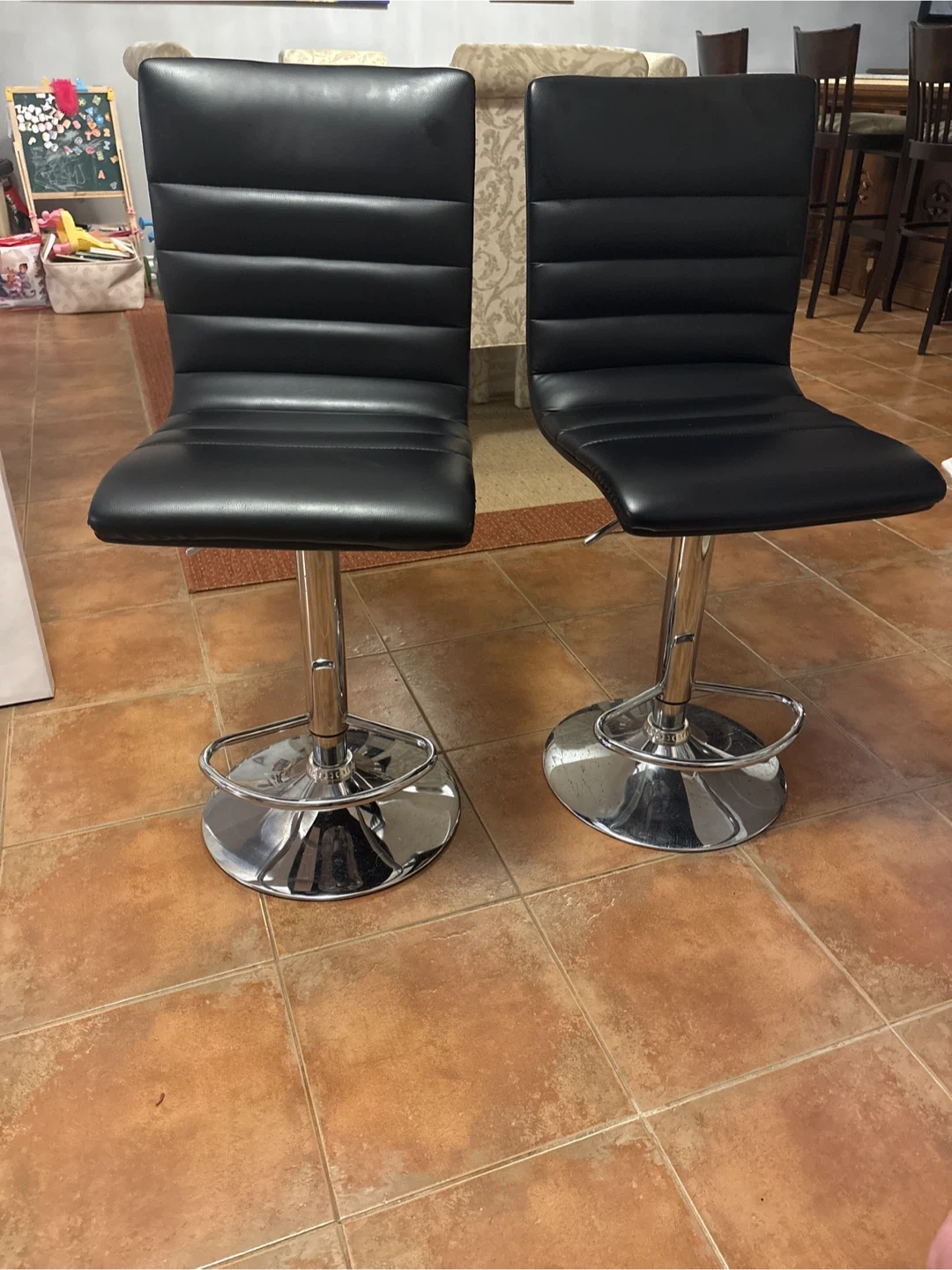 Selling a set of two black faux leather bar stools. They feature a comfortable, padded seat with a ribbed design and a chrome adjustable height base. These stools are perfect for a kitchen island or home bar area.
