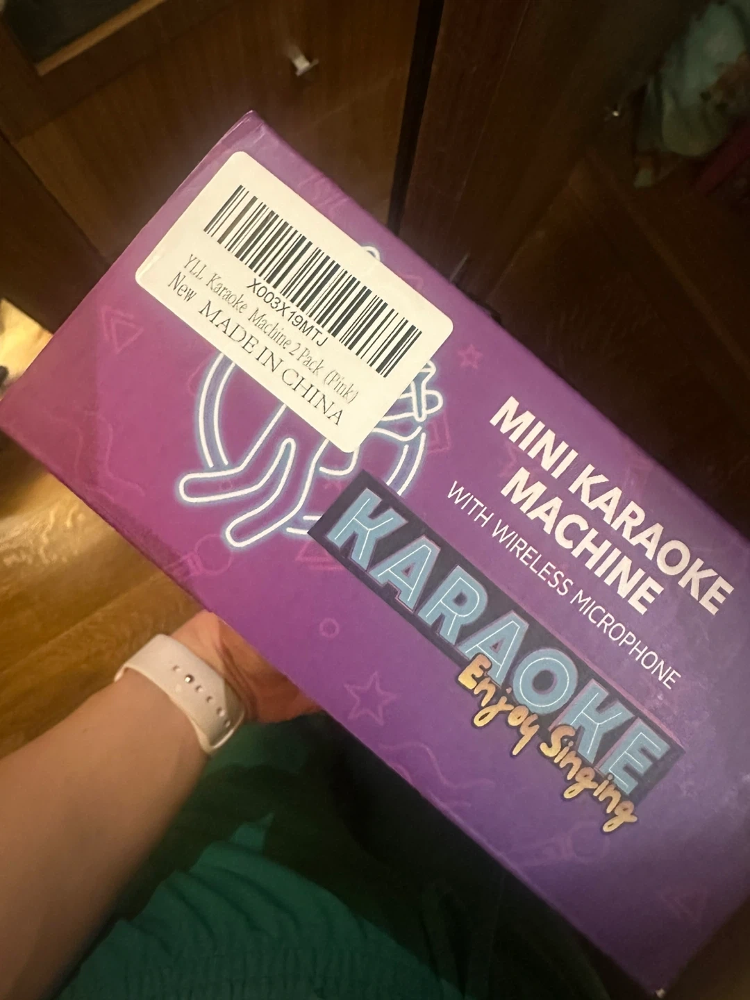 I'm selling a brand new mini karaoke machine 2-pack in pink! It comes with a wireless microphone so you can enjoy singing. It's suitable for ages 3+
