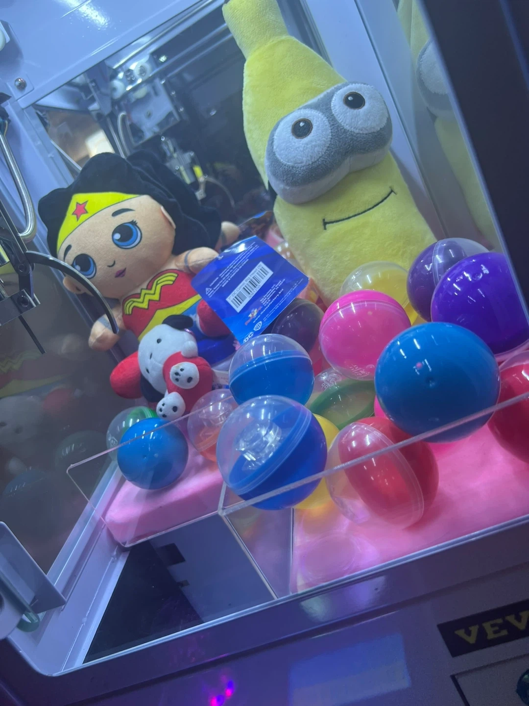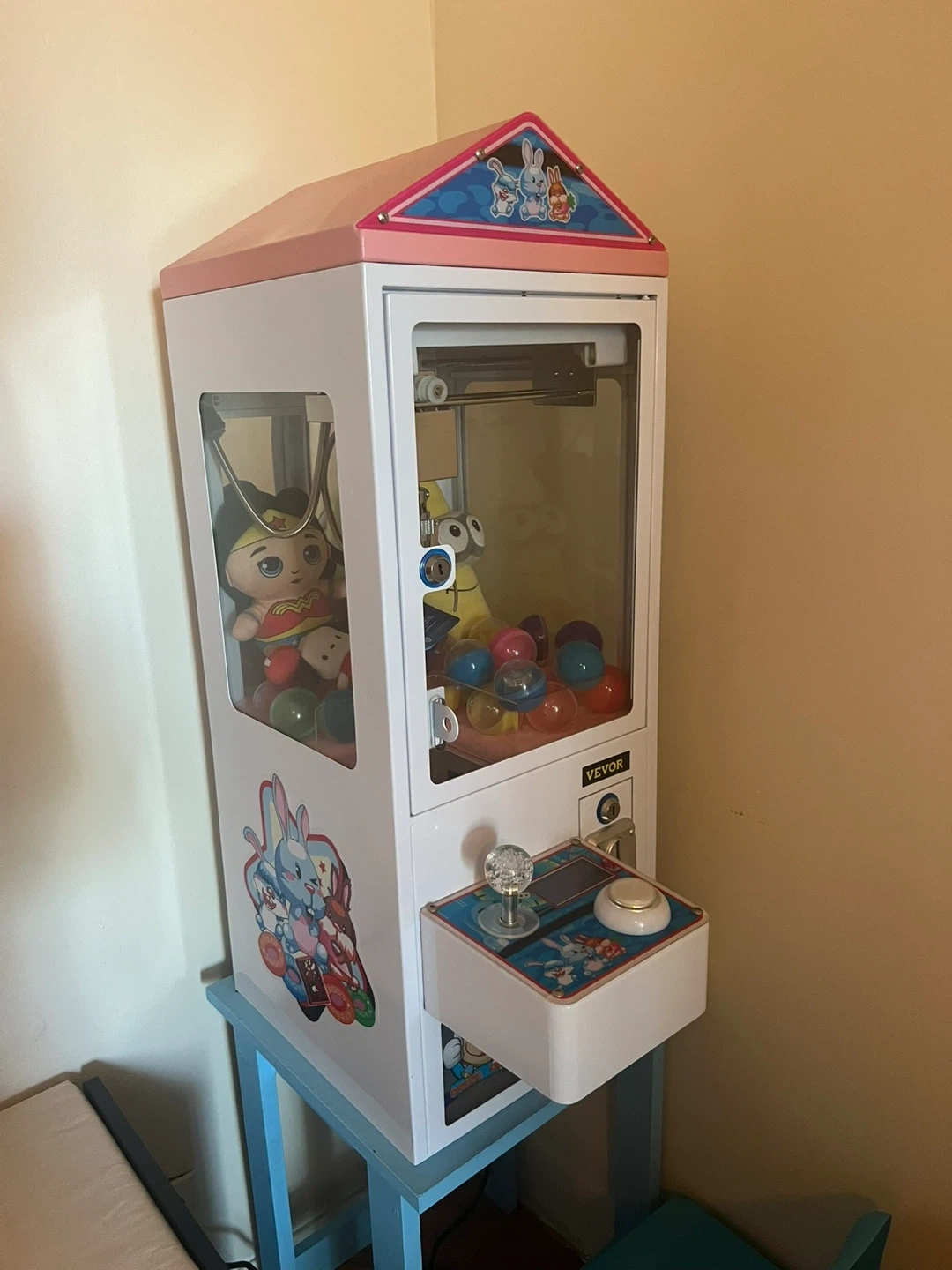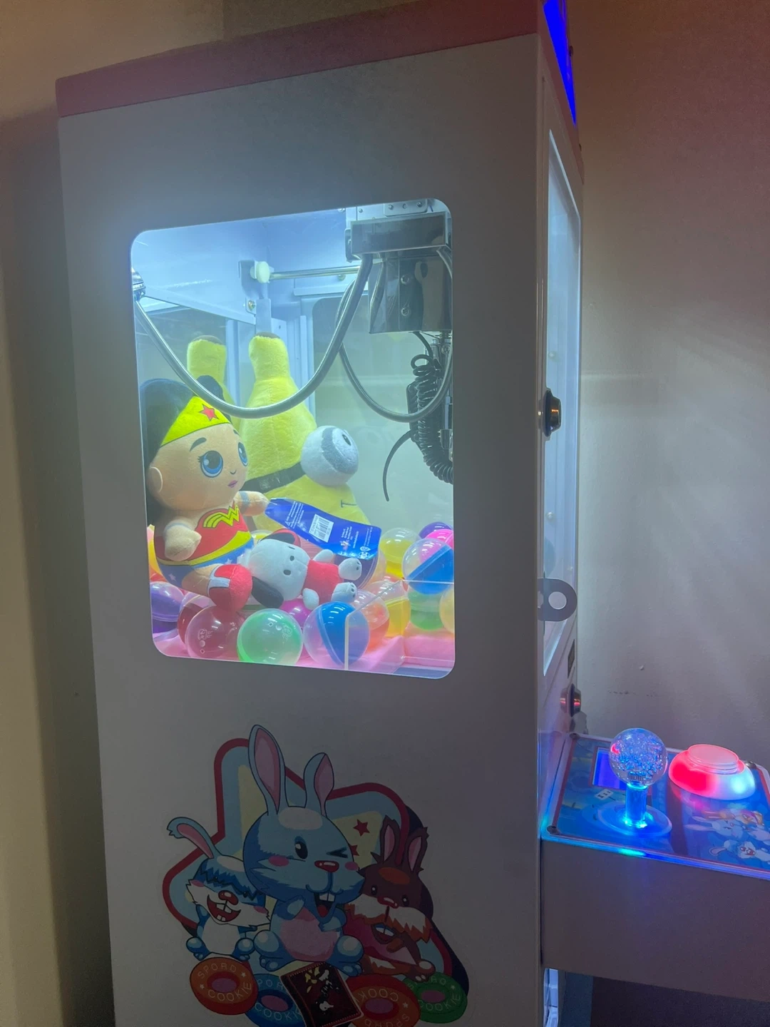 This brand new mini claw machine is perfect for parties or home entertainment. It includes plush toys and colorful capsules, ready to be won! It's designed for coin operation, making it a fun addition to any game room.