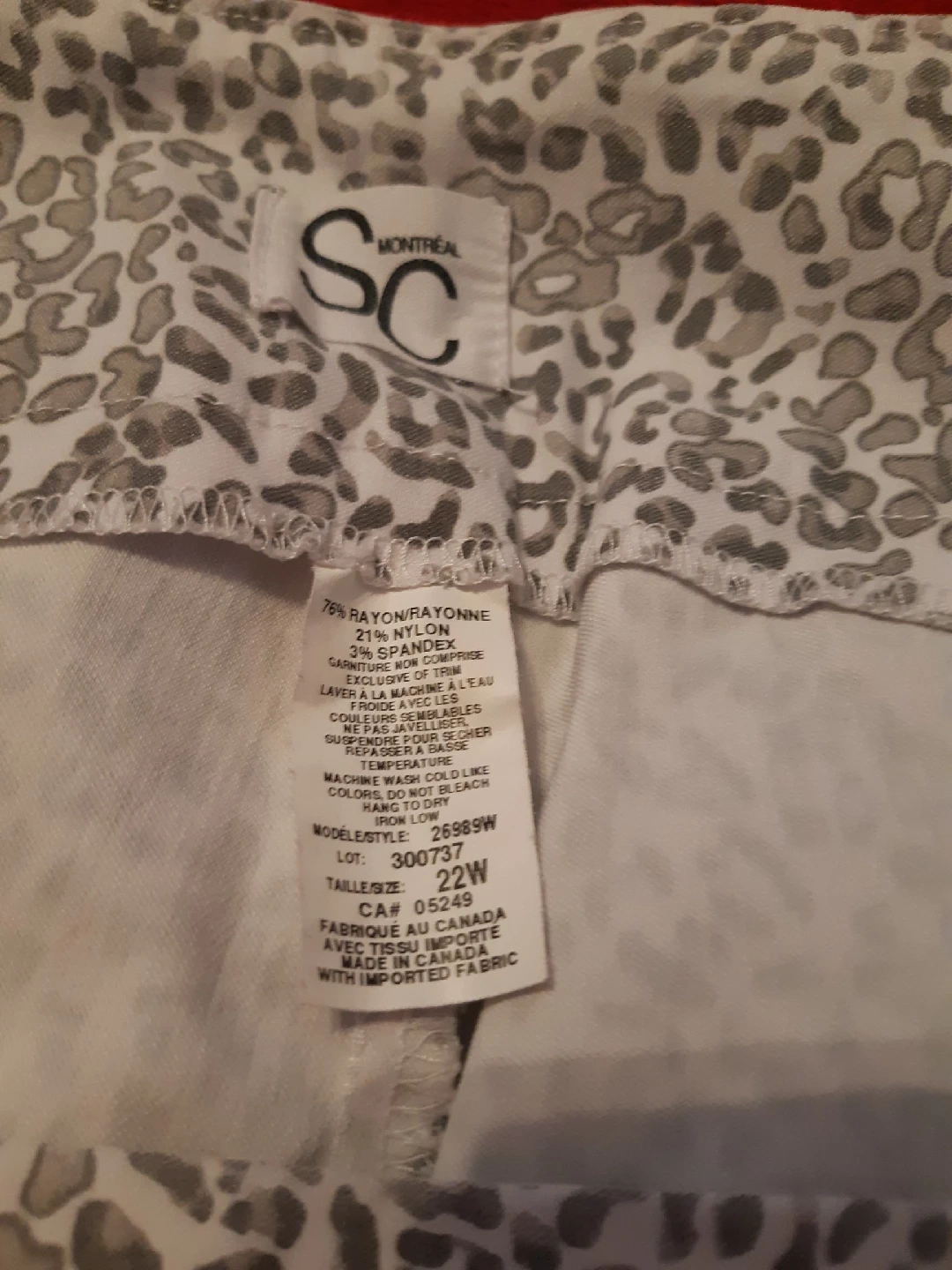 Cute SC Montreal pants in a fun leopard print! They're a size 22W and made of a comfy blend of rayon, nylon, and spandex. Perfect for adding a little flair to your wardrobe The pants fit SO nice and comfortable. top matchs so perfect and hangs so nice. shirt comes with the pants.