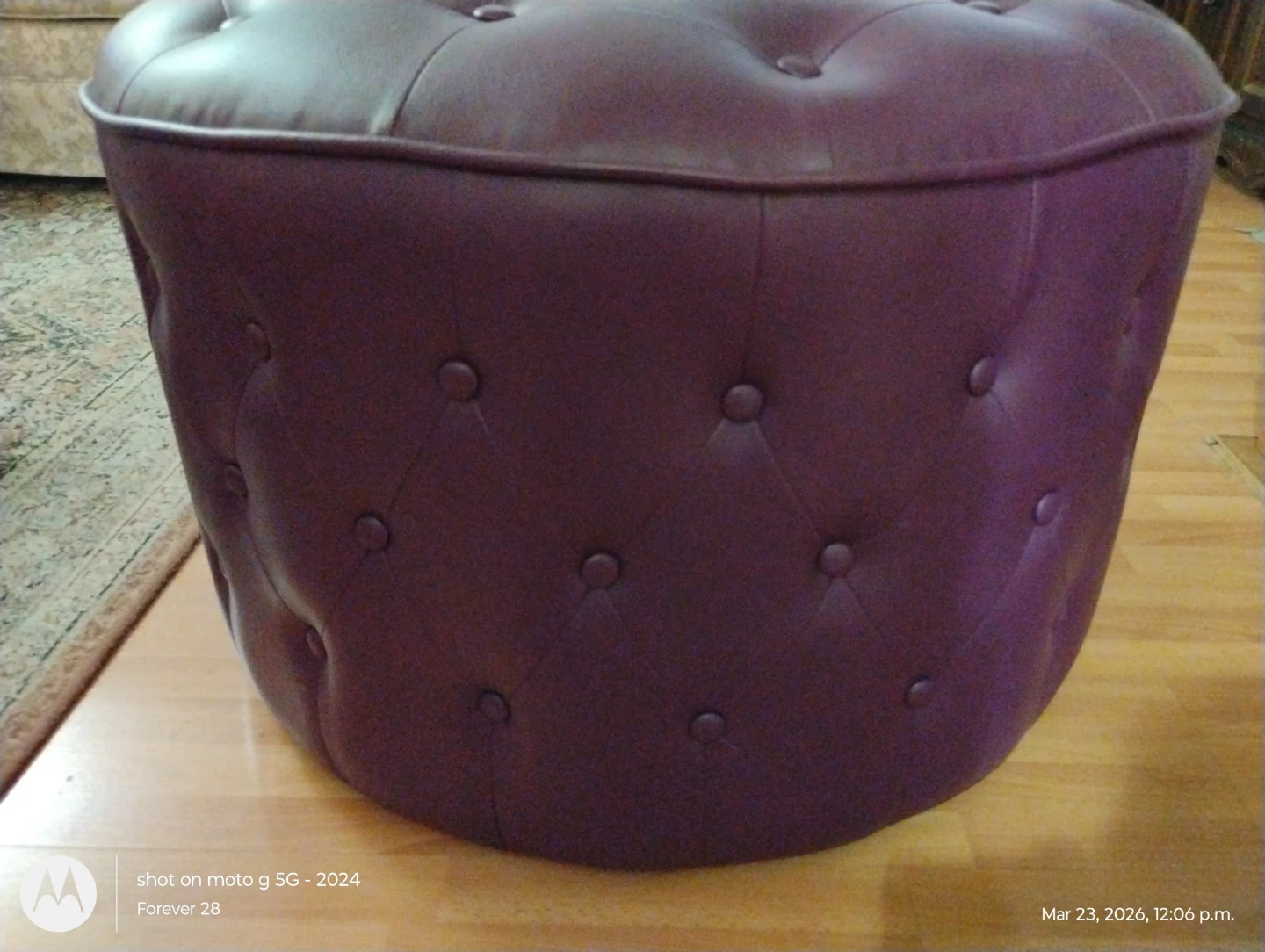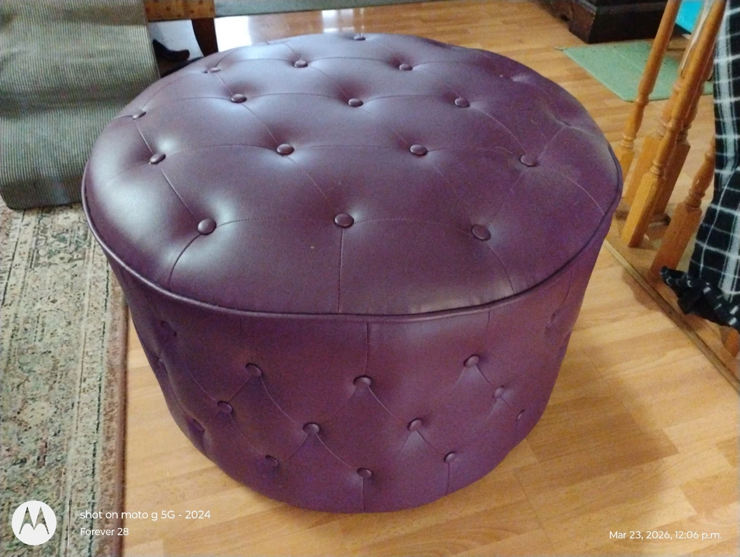 This is a purple ottoman with a tufted design. It's upholstered in a faux leather material. W32" x H20"