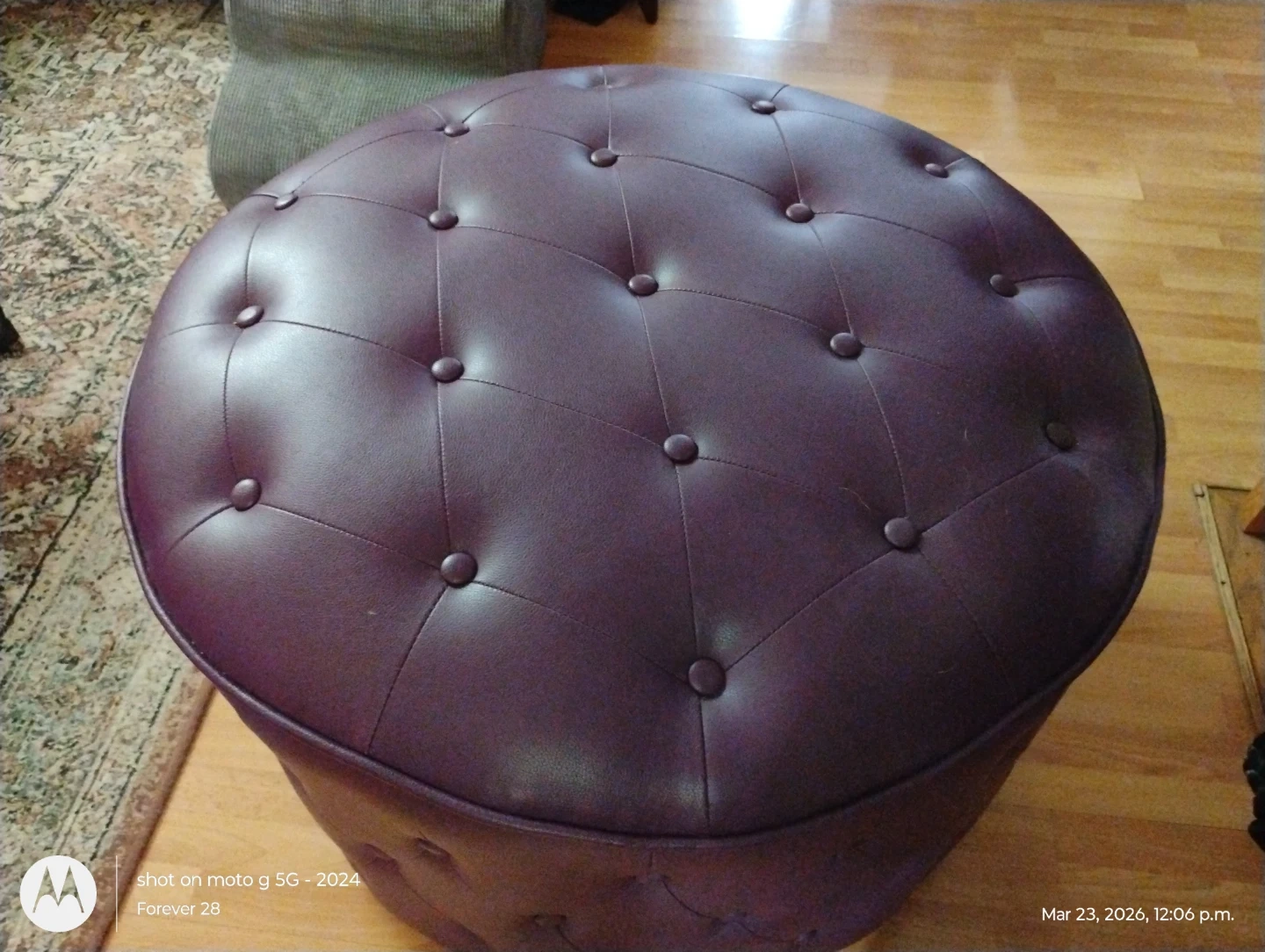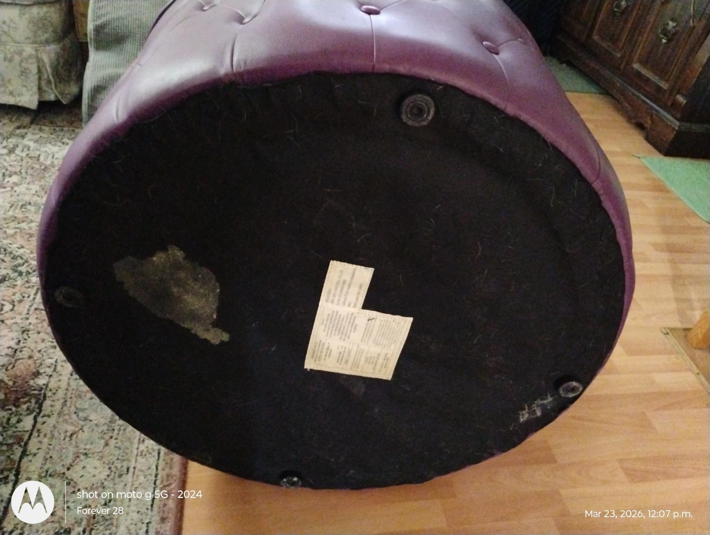 This is a purple ottoman with a tufted design. It's upholstered in a faux leather material. W32" x H20"